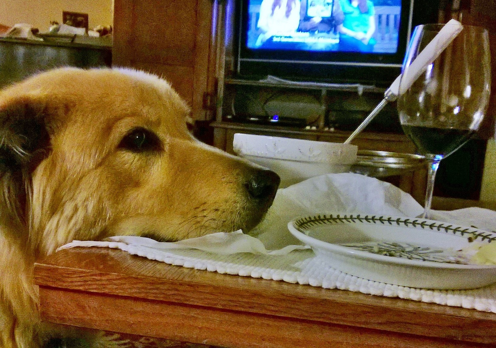 It is a virtue to practice restraint as documented by our dog, Sammy, who is seen here eyeing a dinner plate last night.He did not lick prematurely. He did not bark. He simply laid his giant head on the table and waited patiently.