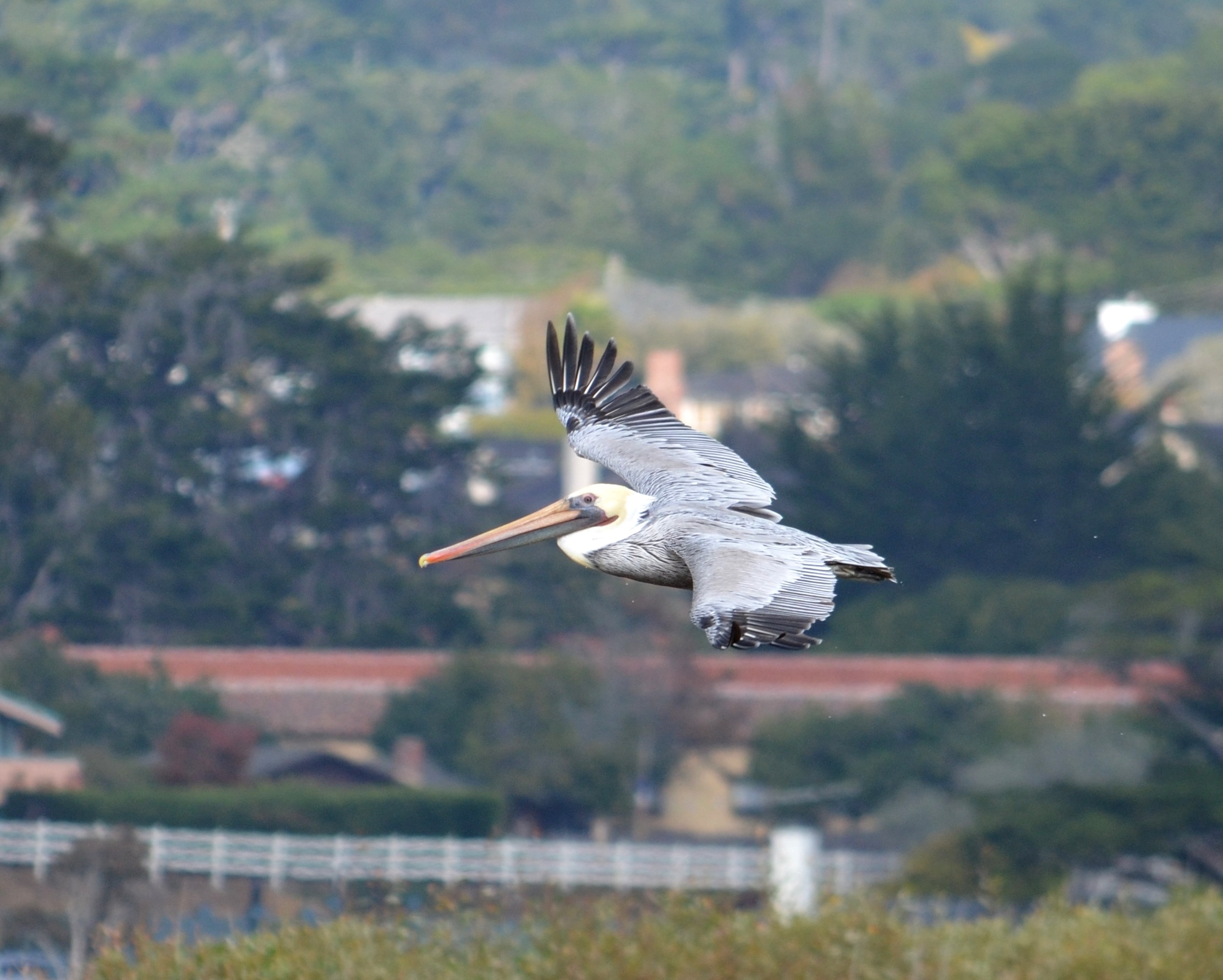 Since I’ve posted on photographing pelicans last week, I thought I add a final touch. If possible, go where the pelicans hang out in large numbers. One such locale is this very unusual spot where the Carmel Bay/Pacific Ocean meets the Carmel River. The river and ocean are usually separated by about 200 feet of beach except in the winter when rains swell the river and it runs into the ocean. Regardless, the pelicans hang out in the river by the beach for a bit before flying to the nearby ocean to catch whatever. They go back and forth throughout the day. So, the photographer simply stands on the beach and waits for this migration.