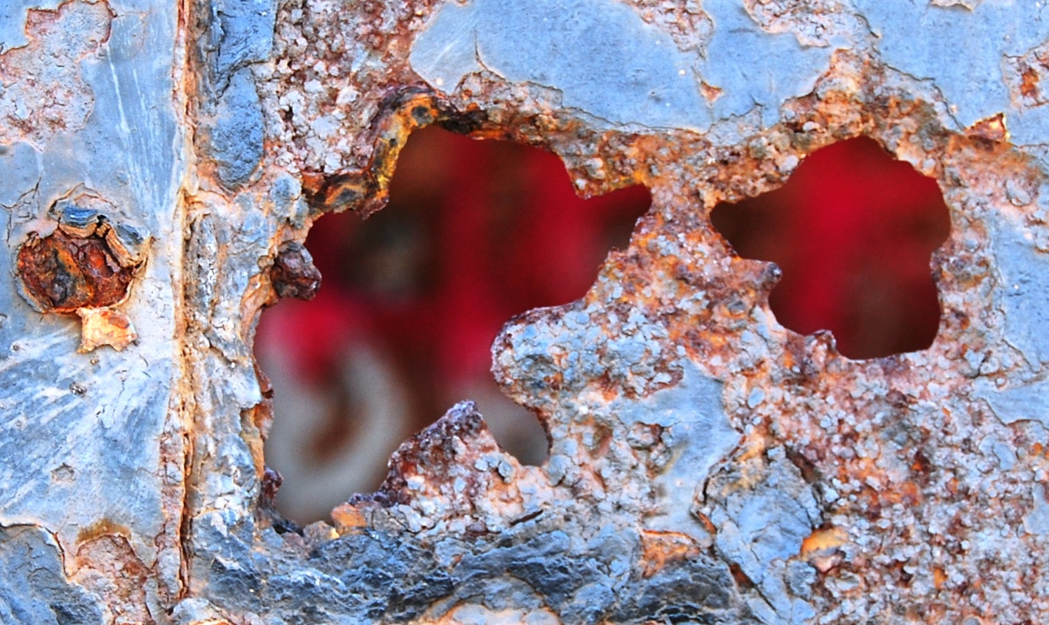 There is beauty in aging metal. It becomes softer with rust rounding edges and pitting surfaces to produce a sunset of its own. The photo on the left was taken at Fort Cronkhite, Marin County, California. The fort was a key WWII site overlooking the Pacific Ocean–set up to defend the coast from enemy invasion. The photo is a close-up of a metal door on an ammo storage facility that is rusting away. The photo on the right is a typical sunset along the Monterey, California coast.