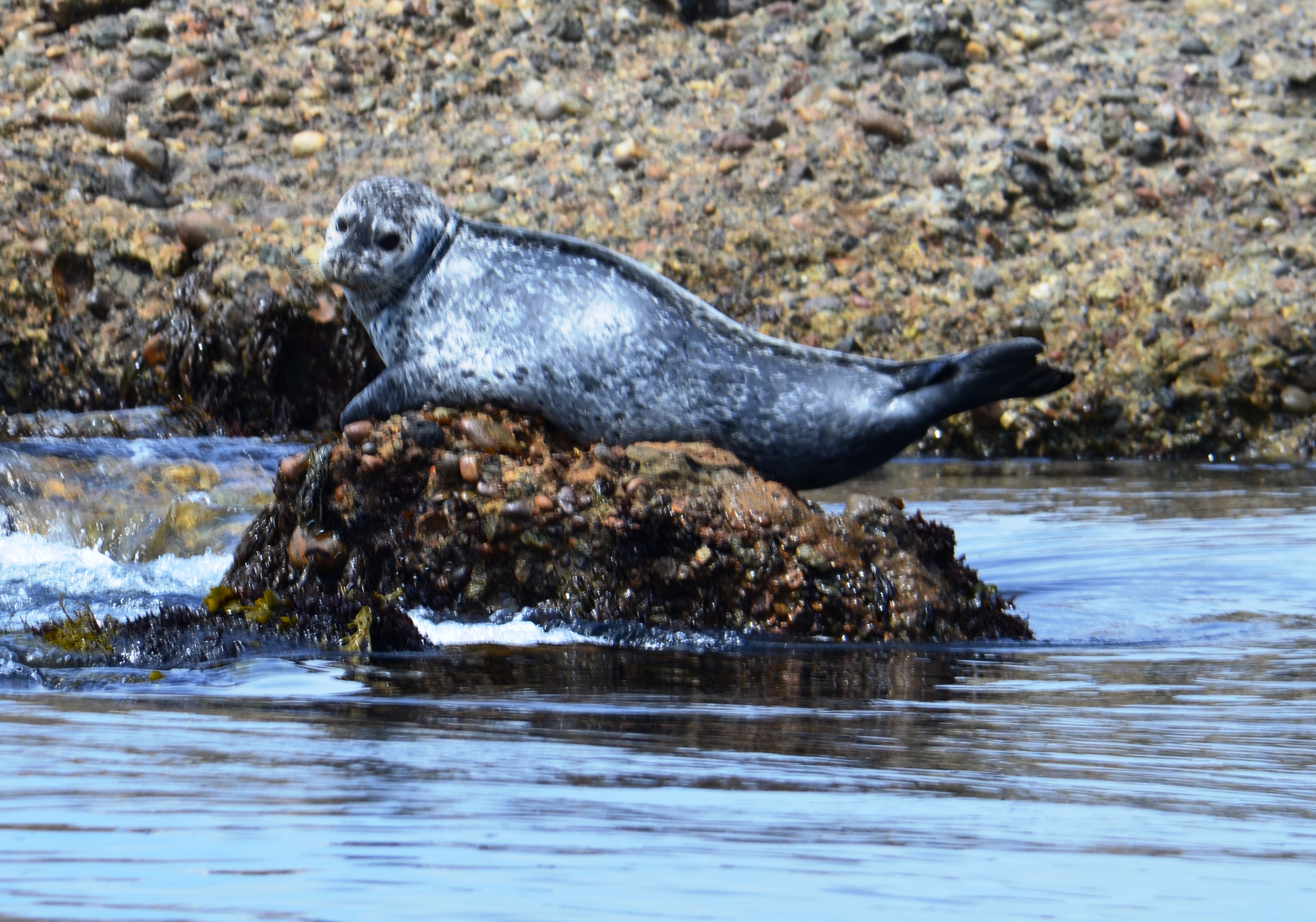 I live near a sea lion that never appears happy to see me. I assume the problem is that he naps on a jagged rock too small for his bulk. This photo was taken with a 300mm telephoto lens earlier this year at California’s Point Lobos State Park in a cove overlooked by most visitors. I call him “Grouch” and he wants to bite me. Click on photo to enlarge.