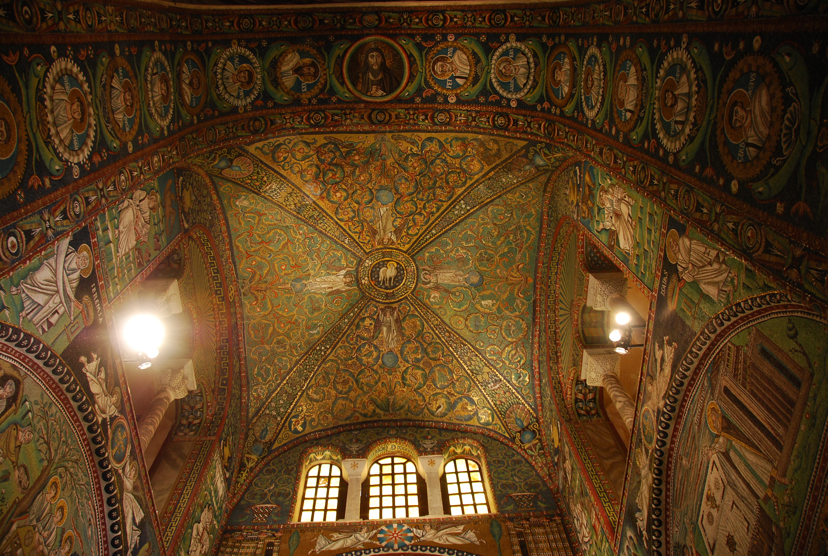 The lighting at the Basilica of San Vitale in Ravenna, Italy is amazing. The ceiling is comprised of colorful tiles, a leading example of early Christian Byzantine art in the western world. The mosaics appear to glow—a fitting dynamic for a church. However, spotlights are required as there isn’t enough sunshine available to show off the ceiling.