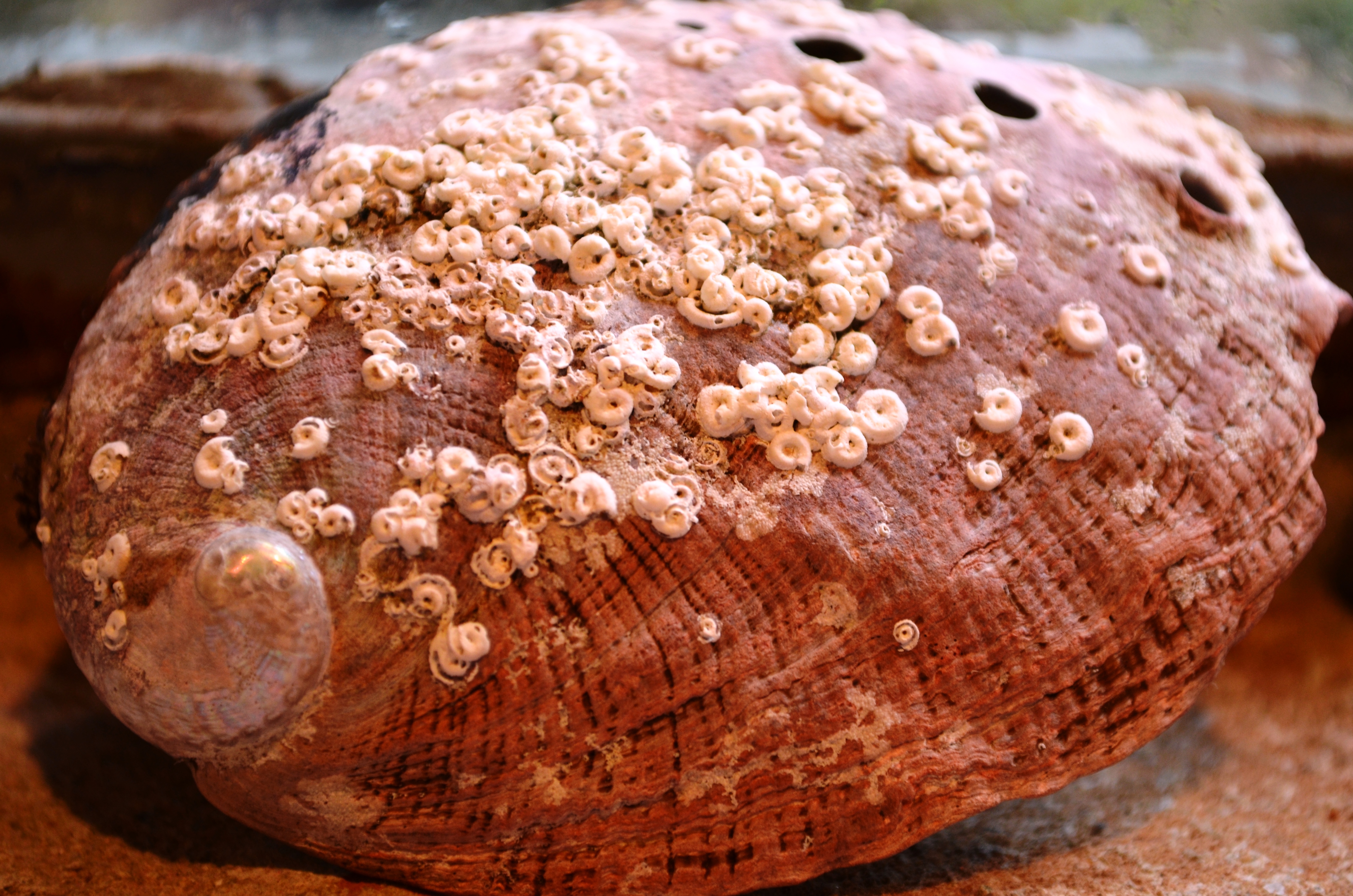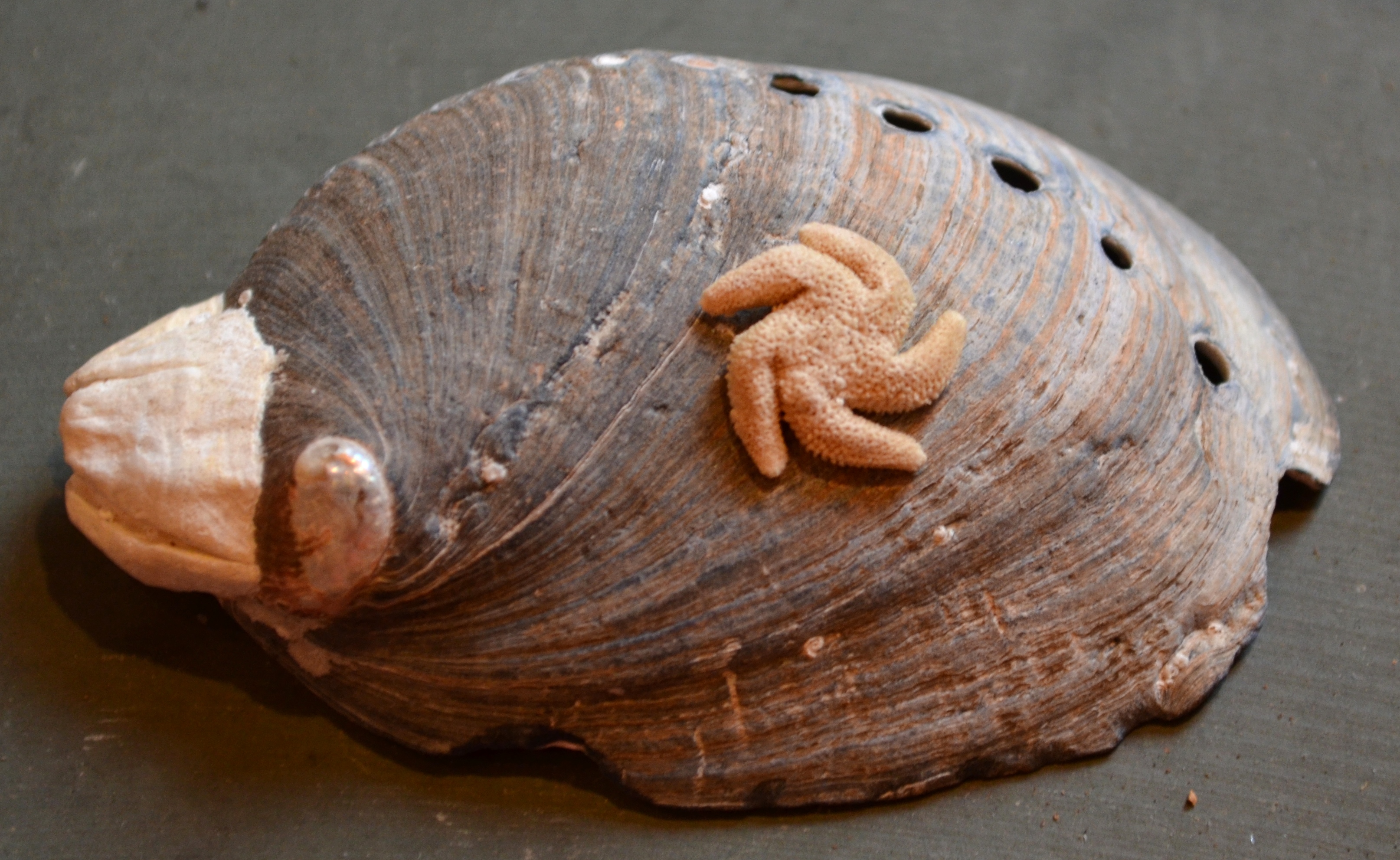 The inside of abalone shells are called “jewels of the ocean” for obvious reasons—they shimmer like silver amid dark green and black rocks, moss, seaweed, etc. I prefer the other side where sea life like this petrified star fish are “glued” to the outer shell. Some people think I arranged this display, but what you see is what I found. The shell on the right is from a red abalone, my favorite.