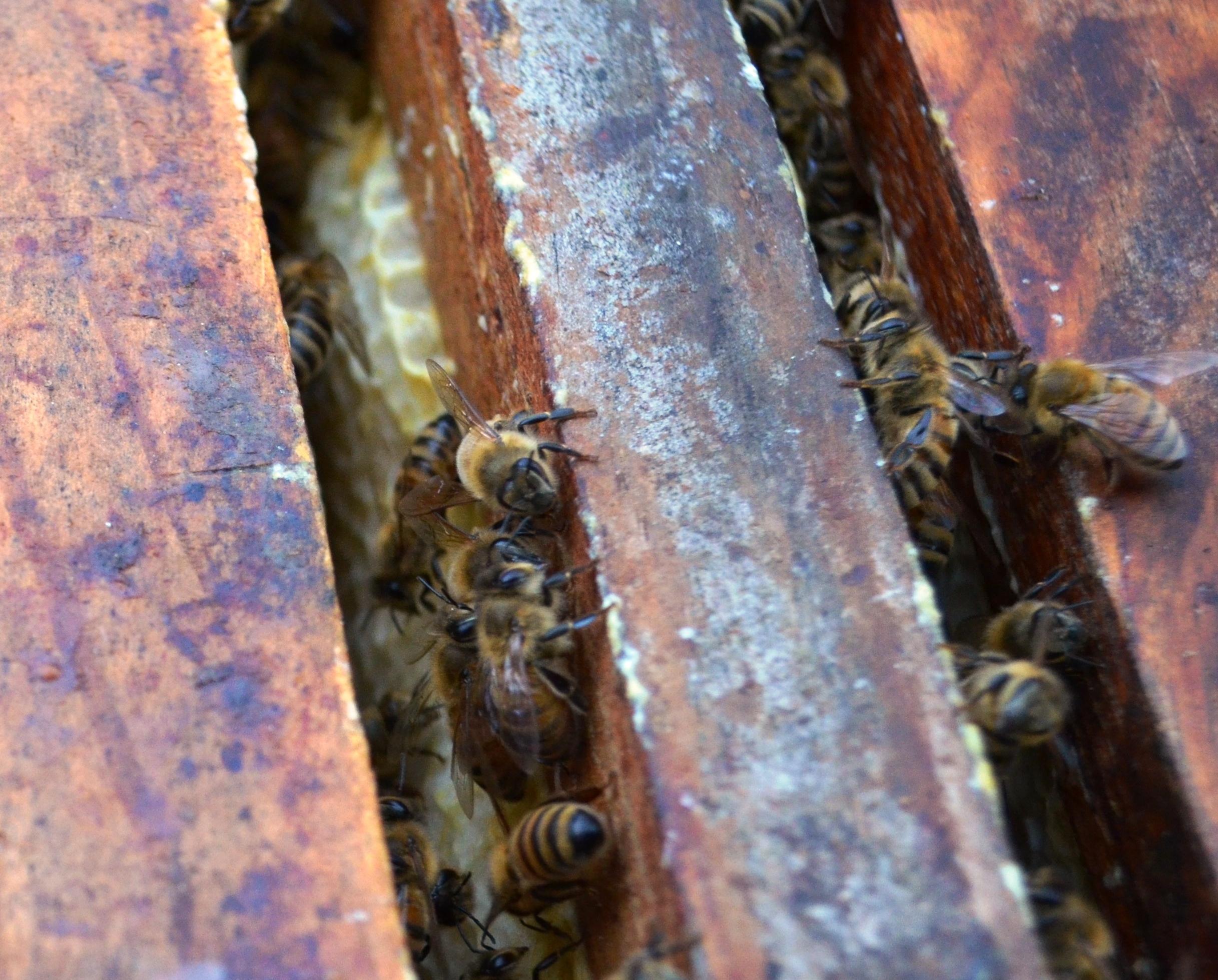 In the middle of winter my bees are buzzing around outside searching for water and limited food sources. Soon they will be living off of the “honey” they’ve made. Took the top off the hive yesterday to capture a shot of them working on new honeycombs attached to wood frames that collectively are called a “super.” I was about a foot away when I took this shot. one bee landed gently on my arm, but otherwise they left me alone. Photo tip of the day: I wore a protective suit.