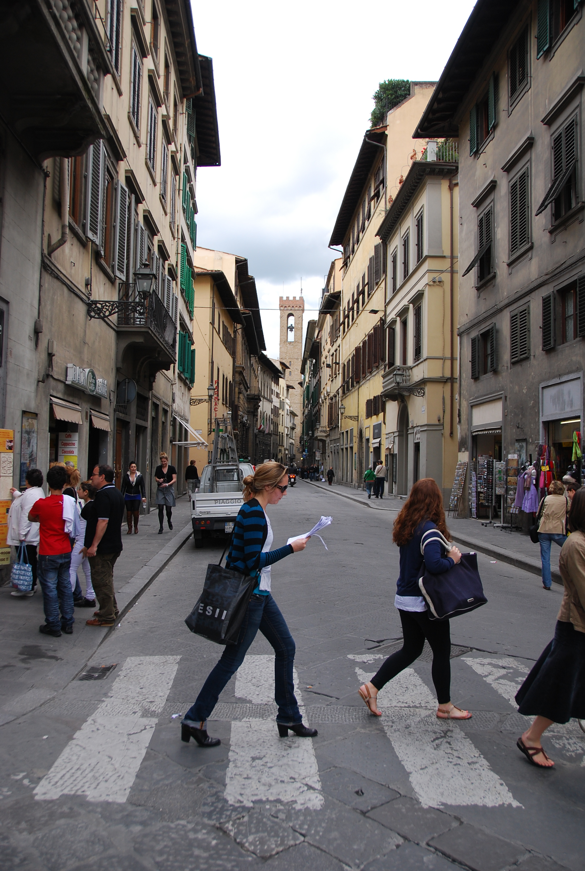 Even in a culturally famous city like Firenze, people focus on other things than old art and buildings. Here a woman reads while crossing a busy street, oblivious to the “must see” bell tower in the distance.