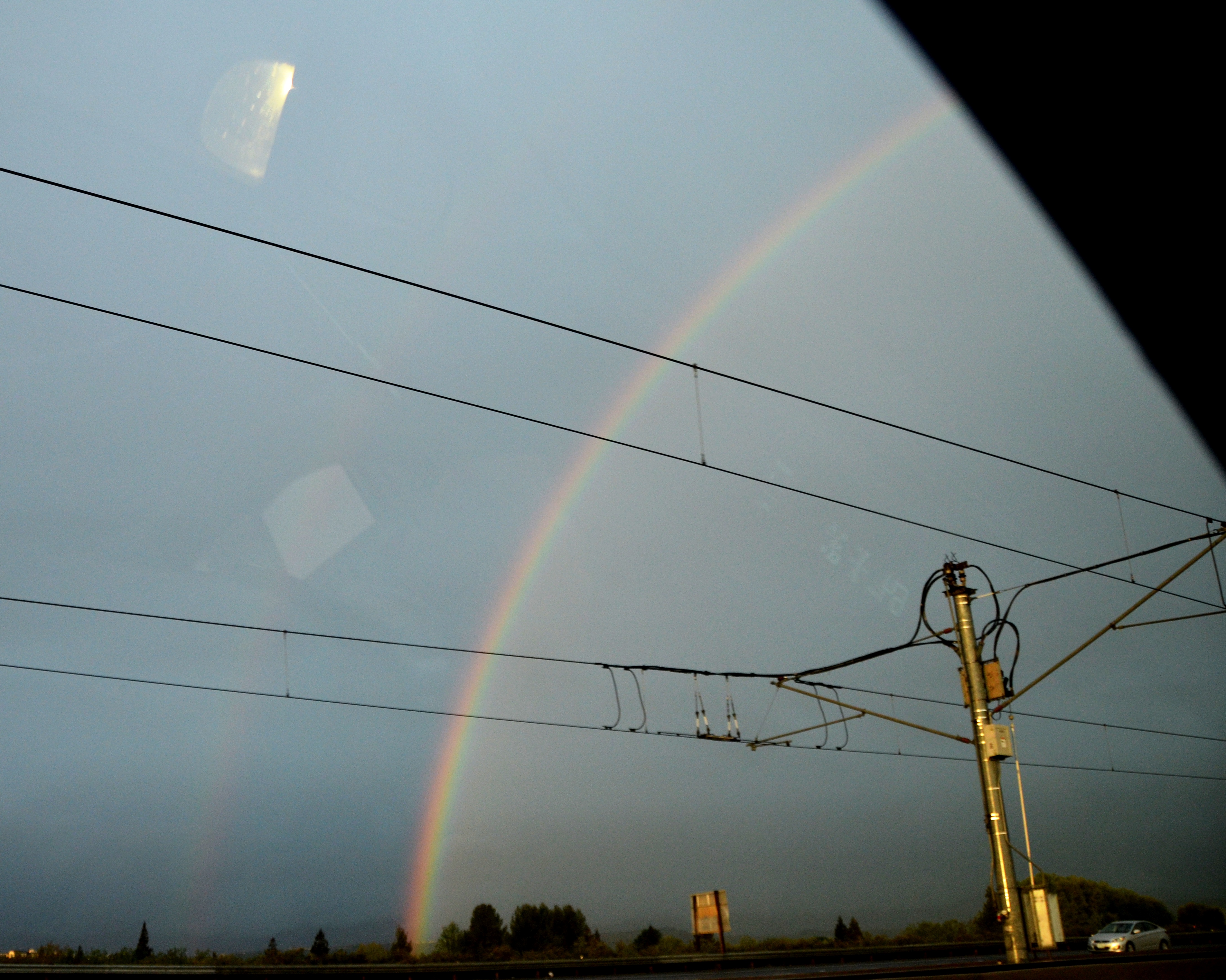 The commute home yesterday in the rain was riddled with three separate accidents but softened at the end by rainbows on both sides of the freeway. At one point I counted six rainbows—there must be a term for this, but don’t know it.