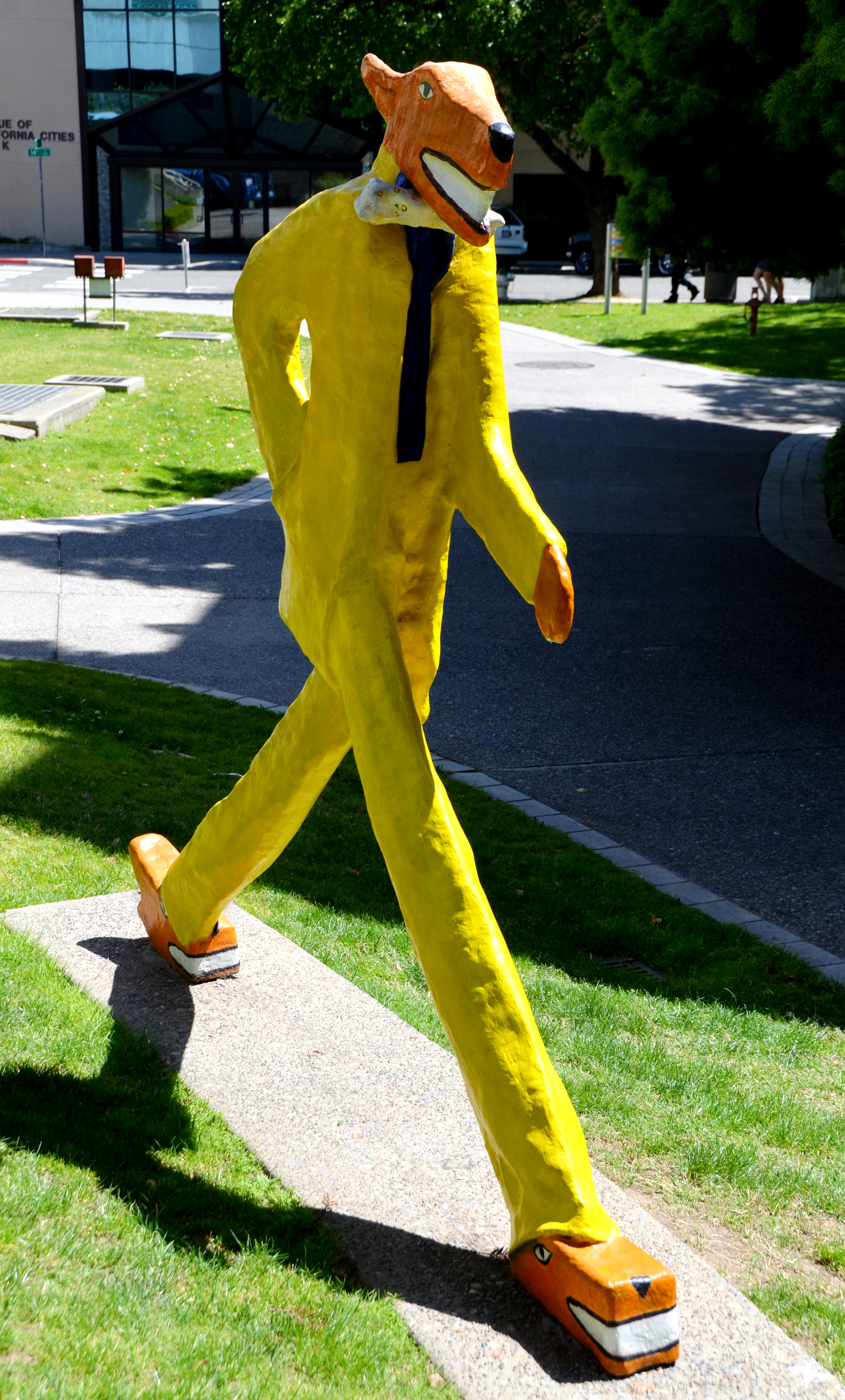 Monuments are man-made structures that often paint history with a broad brush, that is, they don’t tell the whole story. So, for this photo challenge I selected a wacky piece of public art unveiled in downtown Sacrament in 2000. “Walking the Dogs,” created by Gilbert “Magu” Sanchez Lujan is my kind of monument. I will confess that for over a decade, I thought this figure was a giant, road tripping rabbit until I read the plaque this year. I took these photos yesterday. One shows the dog reflected in a window with a shutterbug tourist. Note how the feet are truly “dogs.”