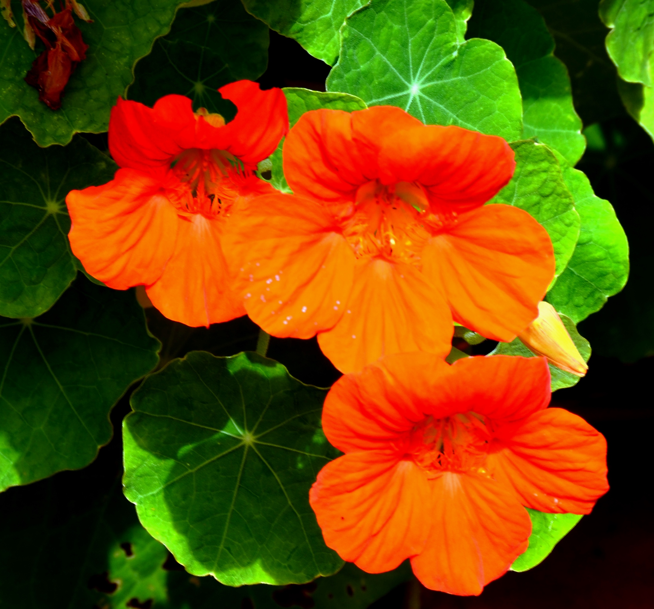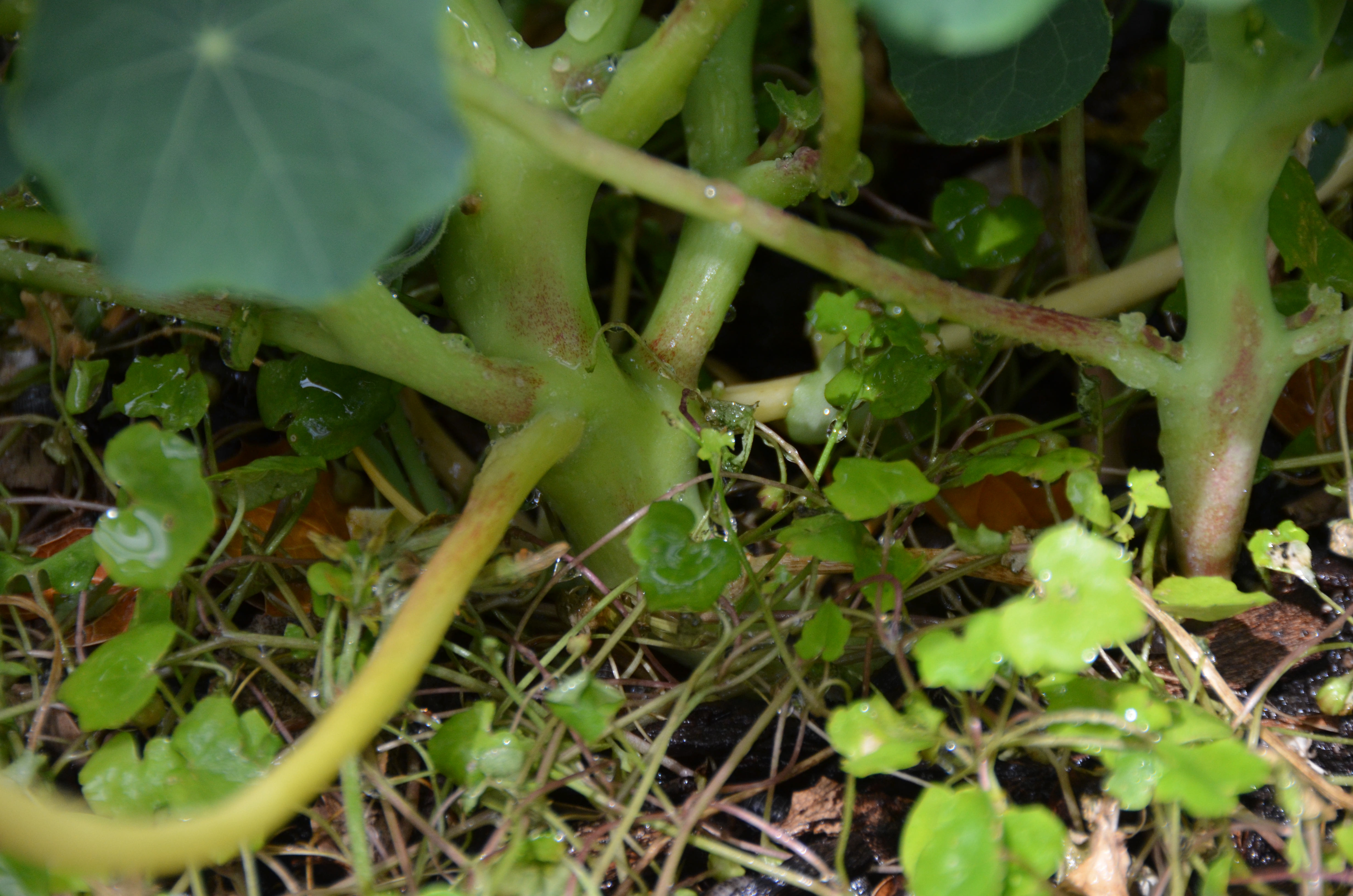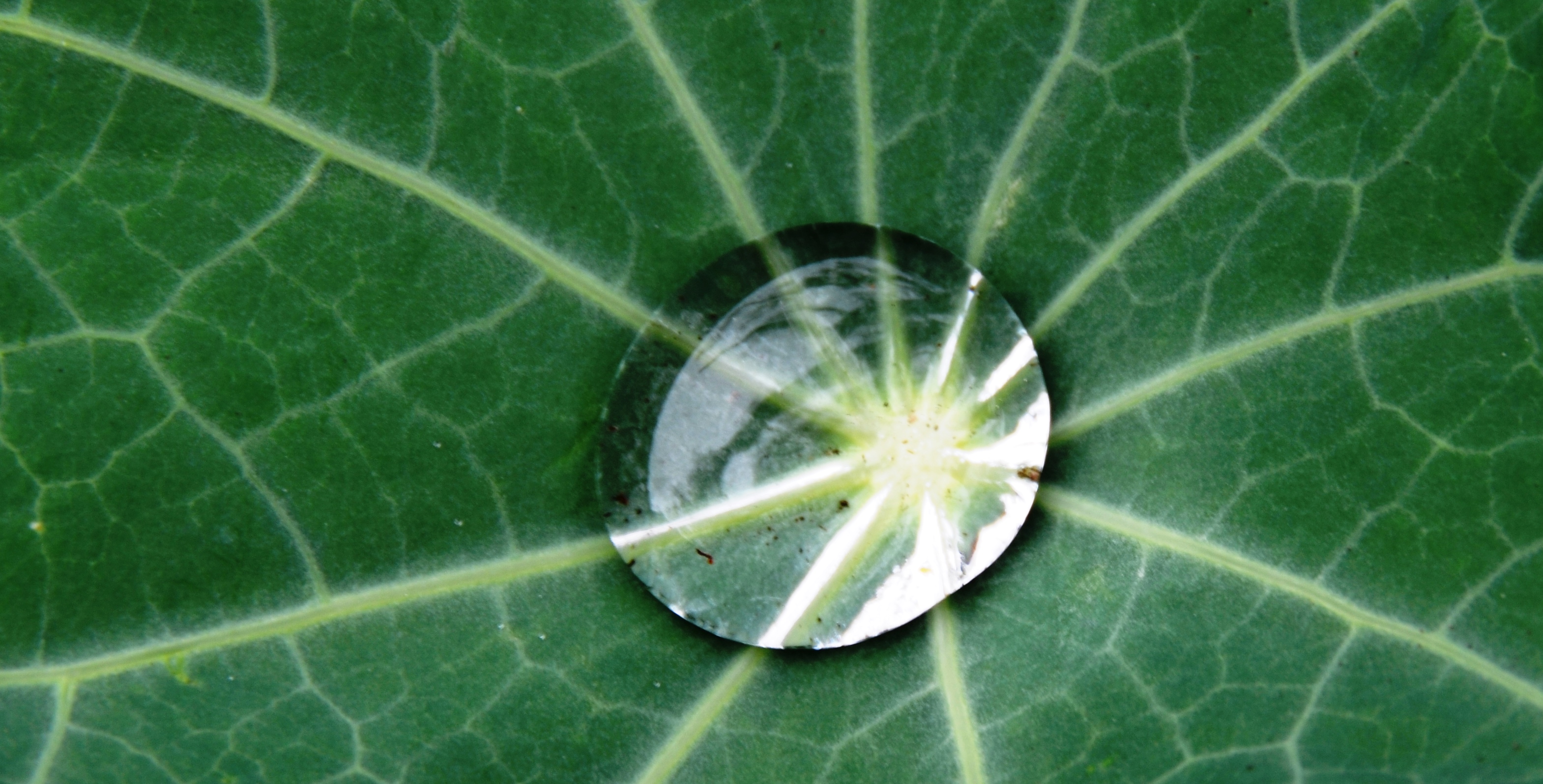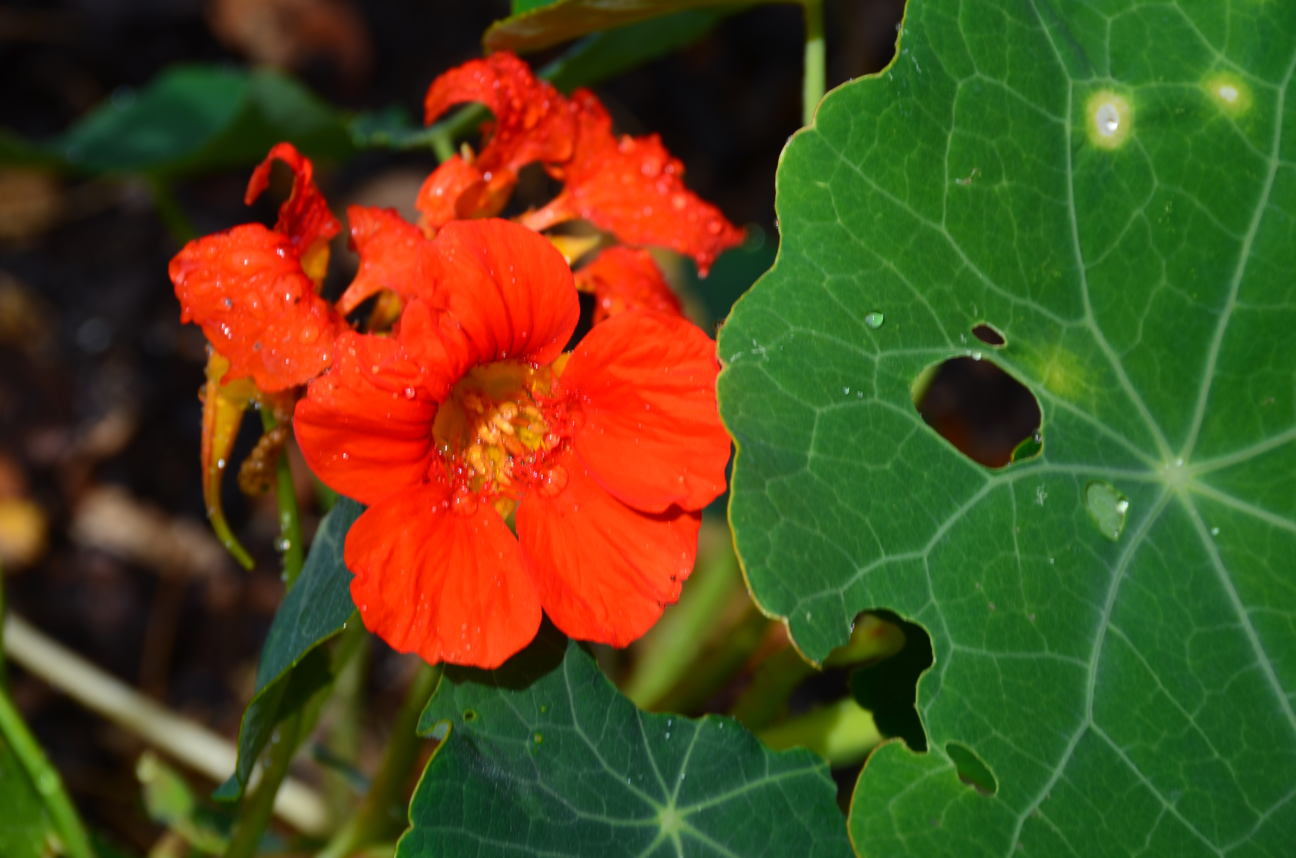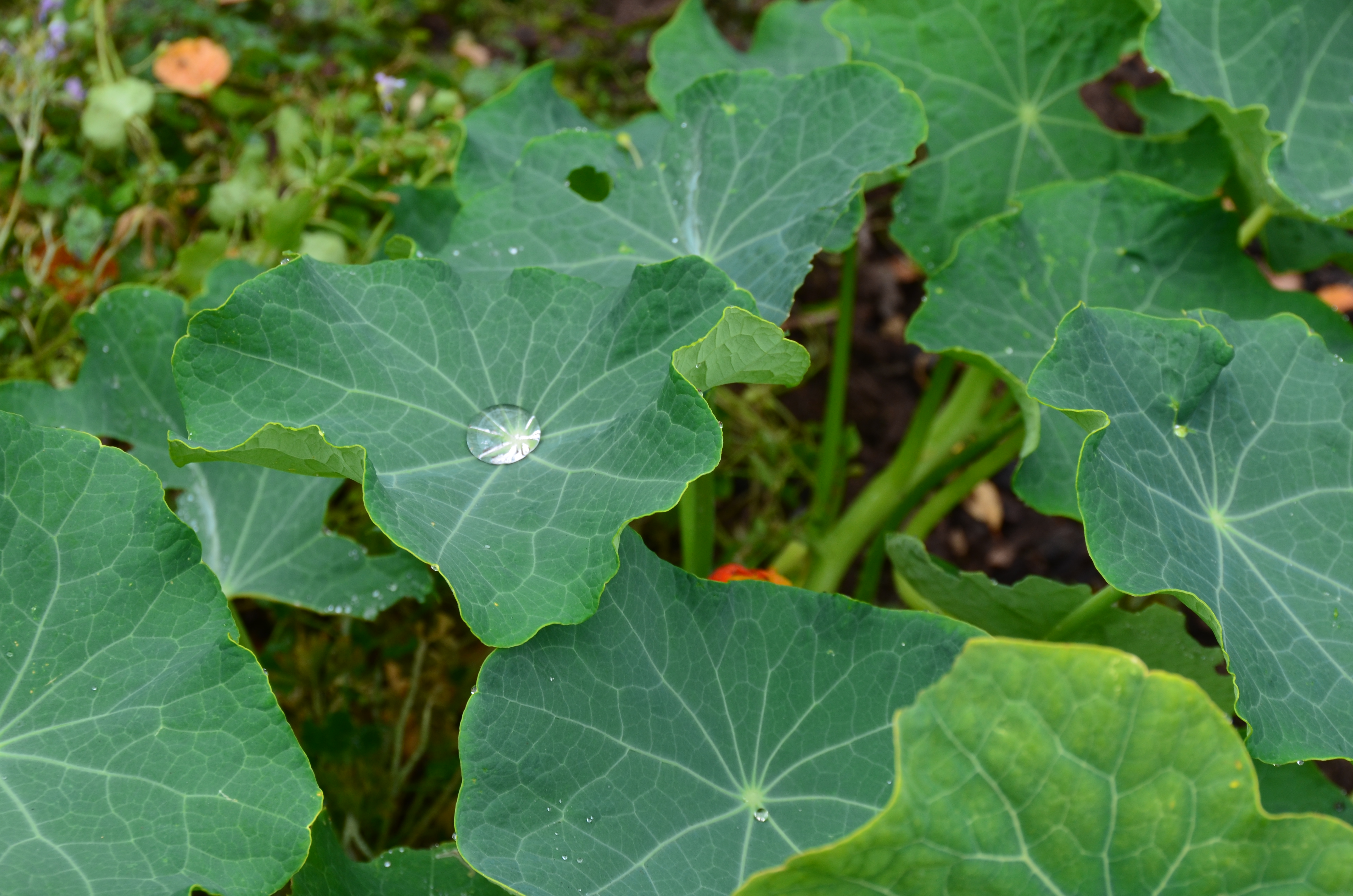 I am the “mad scientist of nasturtiums.” Over this past winter I dried the seed pods of the most prolific nasturtiums of 2013. I planted five seeds in very loose soil in April of this year. Kaboom! I now have nasturtiums with giant deeply veined leaves, as noted in the photo—that’s a drop of water in the center.
