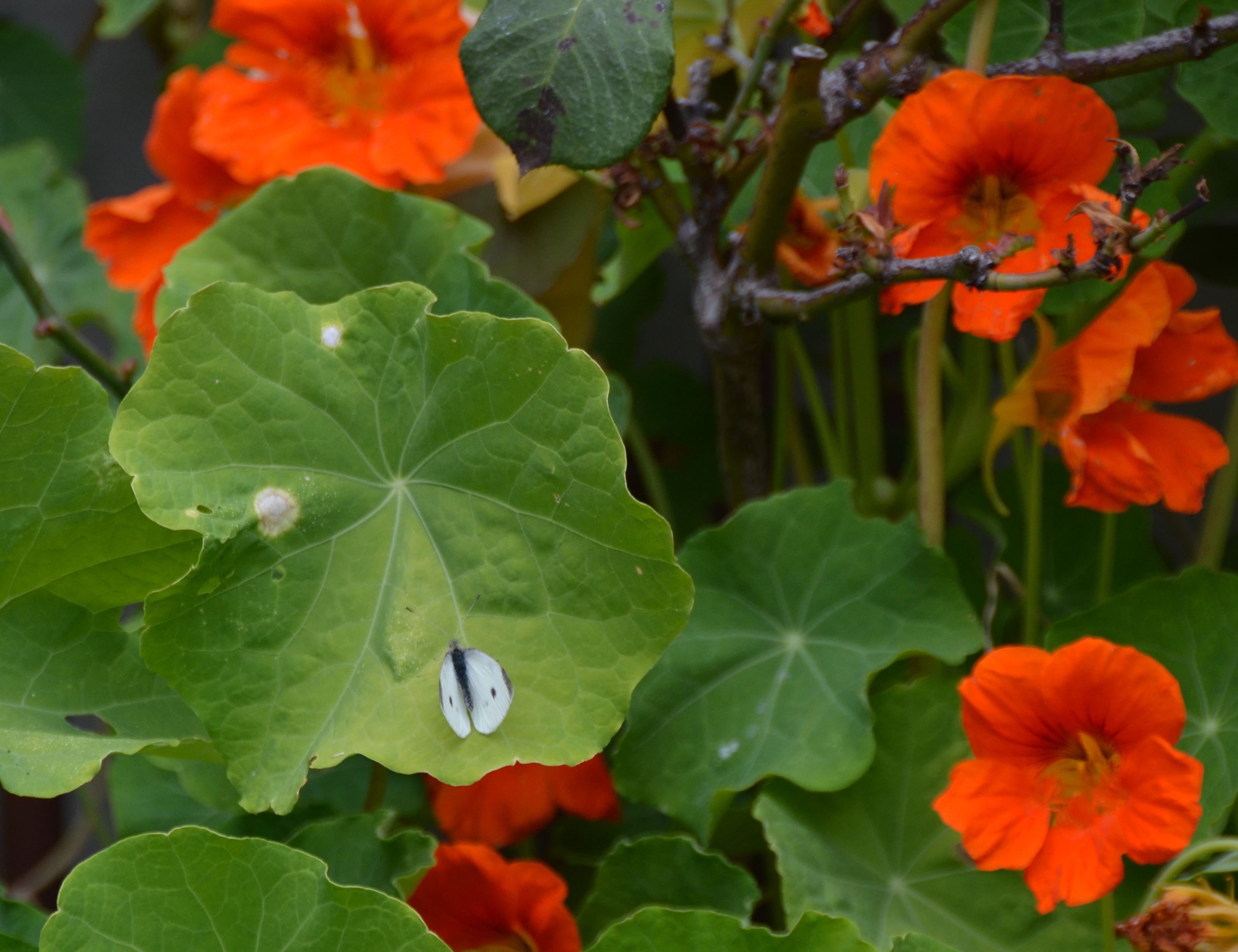 These nasturtiums are loved by bees, butterflies and humming birds. But I find that the large leaves afford more room for butterflies to land. Note how the Cabbage White butterfly is dwarfed by the leaf.