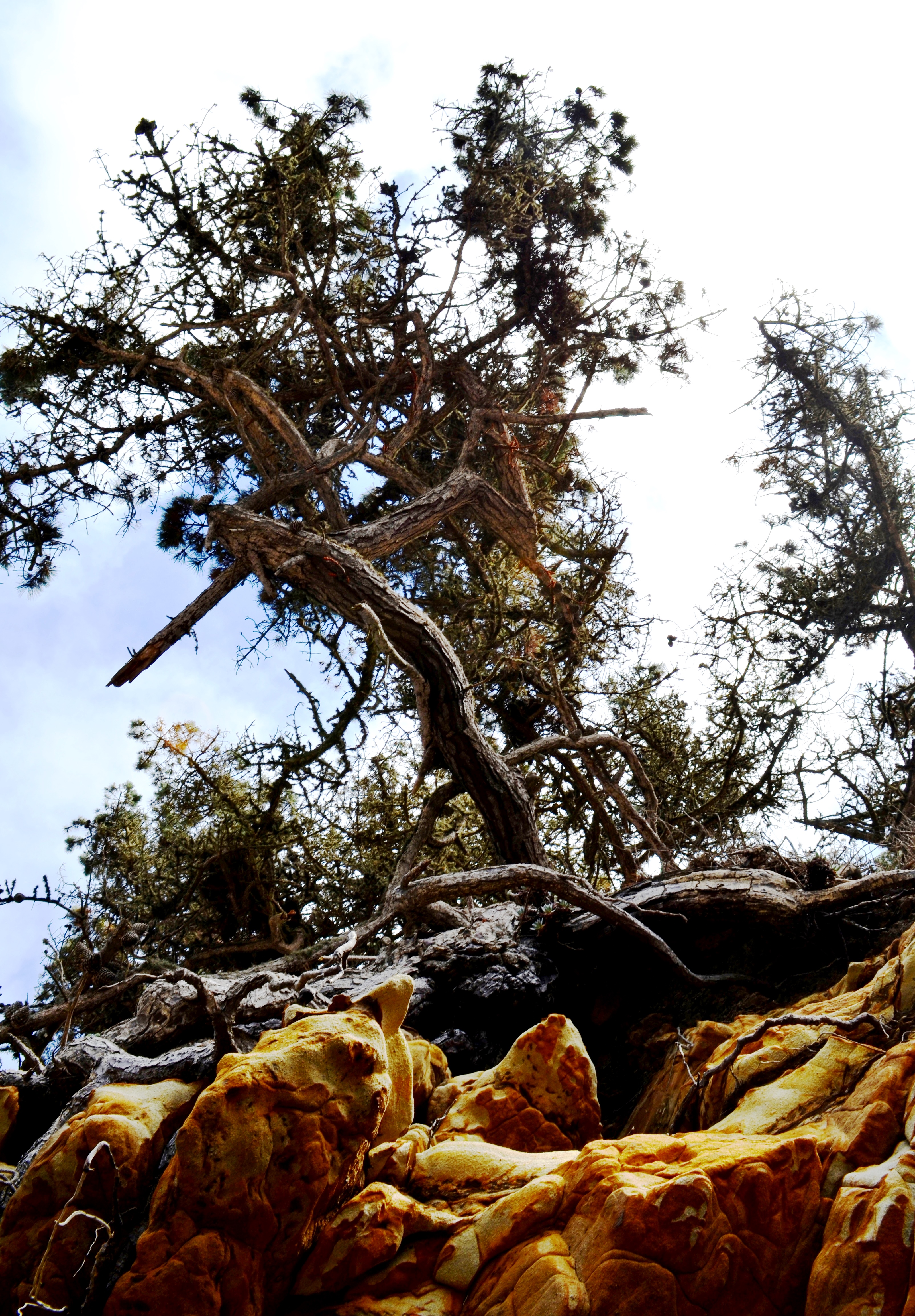 There are two twists in this photo. The obvious one is the gnarled roots and branches of the tree. The second is that the frame of reference is counter to our expected visual experience–we look up, almost underneath a tree that doesn’t belong where it is, based on all the times of looking at trees.