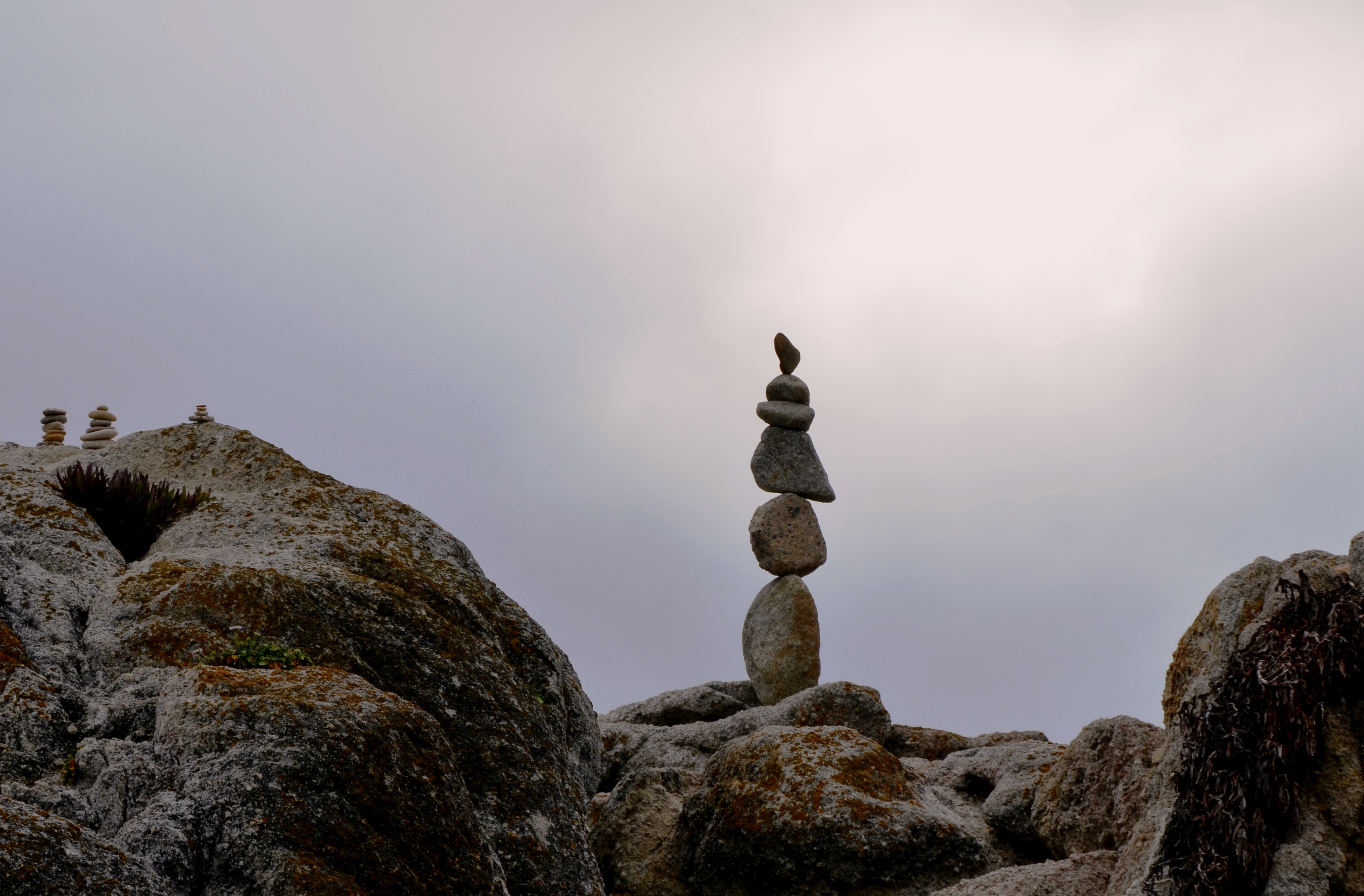 We have a poor man’s Stonehenge at Carmel Point, California as noted in the above photo. These rocky balancing acts are common along the coast, but this one is particularly contrary to the laws of gravity.