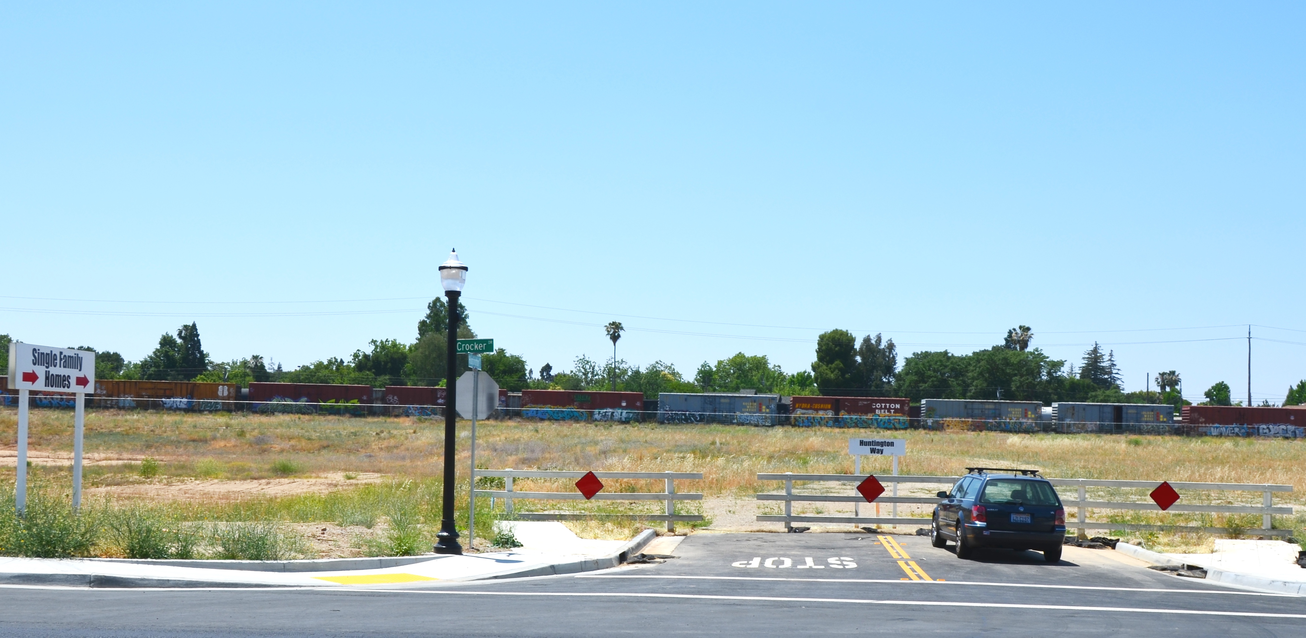 It was 94 yesterday in Sacramento and those “Union Pacific” railroad yard homes remain a 10-year promise in the beating sun. I’m told it’s a question of permits. The only homes in what is called Curtis Park Village, however, are in those rail cars.
