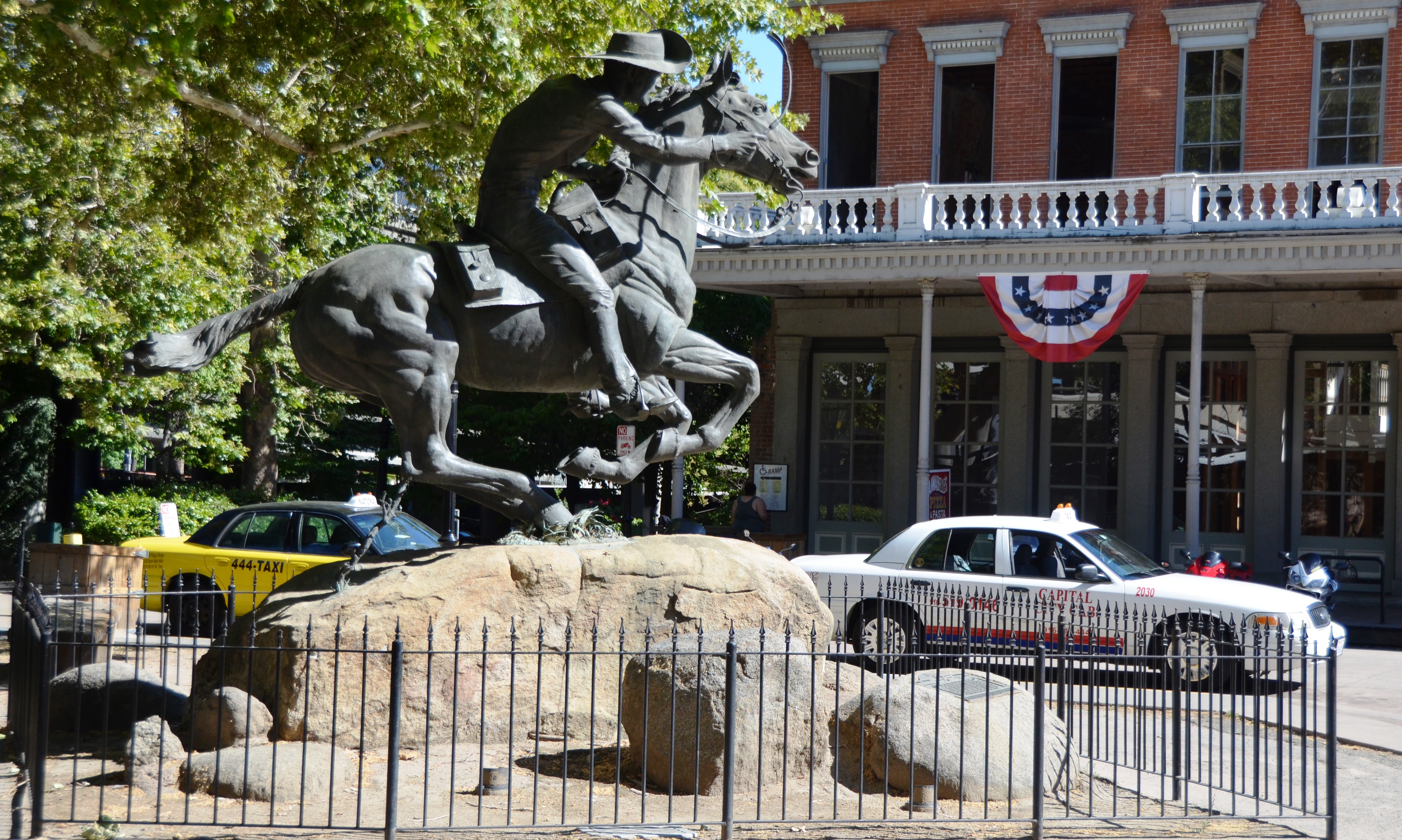 It was 103-degrees yesterday in downtown Sacramento where I visited Sam Hamilton, the first Pony Express rider. He started his gallop in a rainstorm at 2:45 a.m. in April, 1860. His statue is by a taxi stand these days.