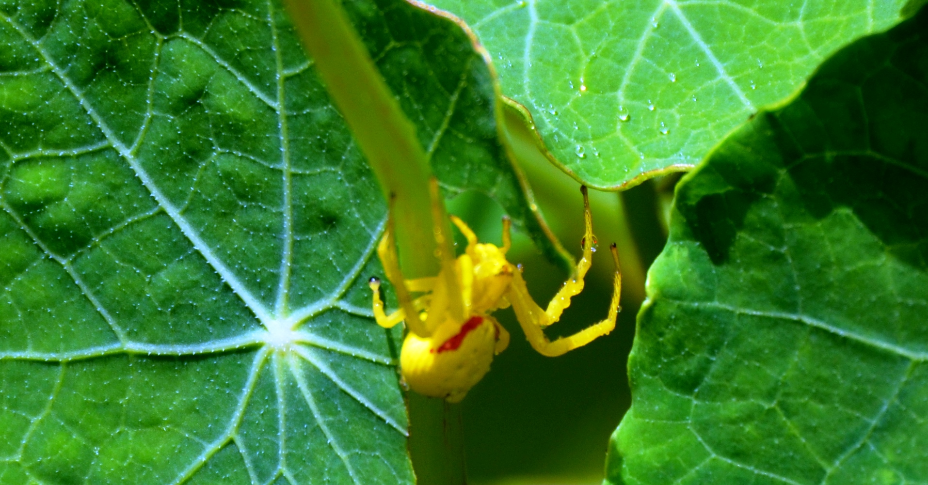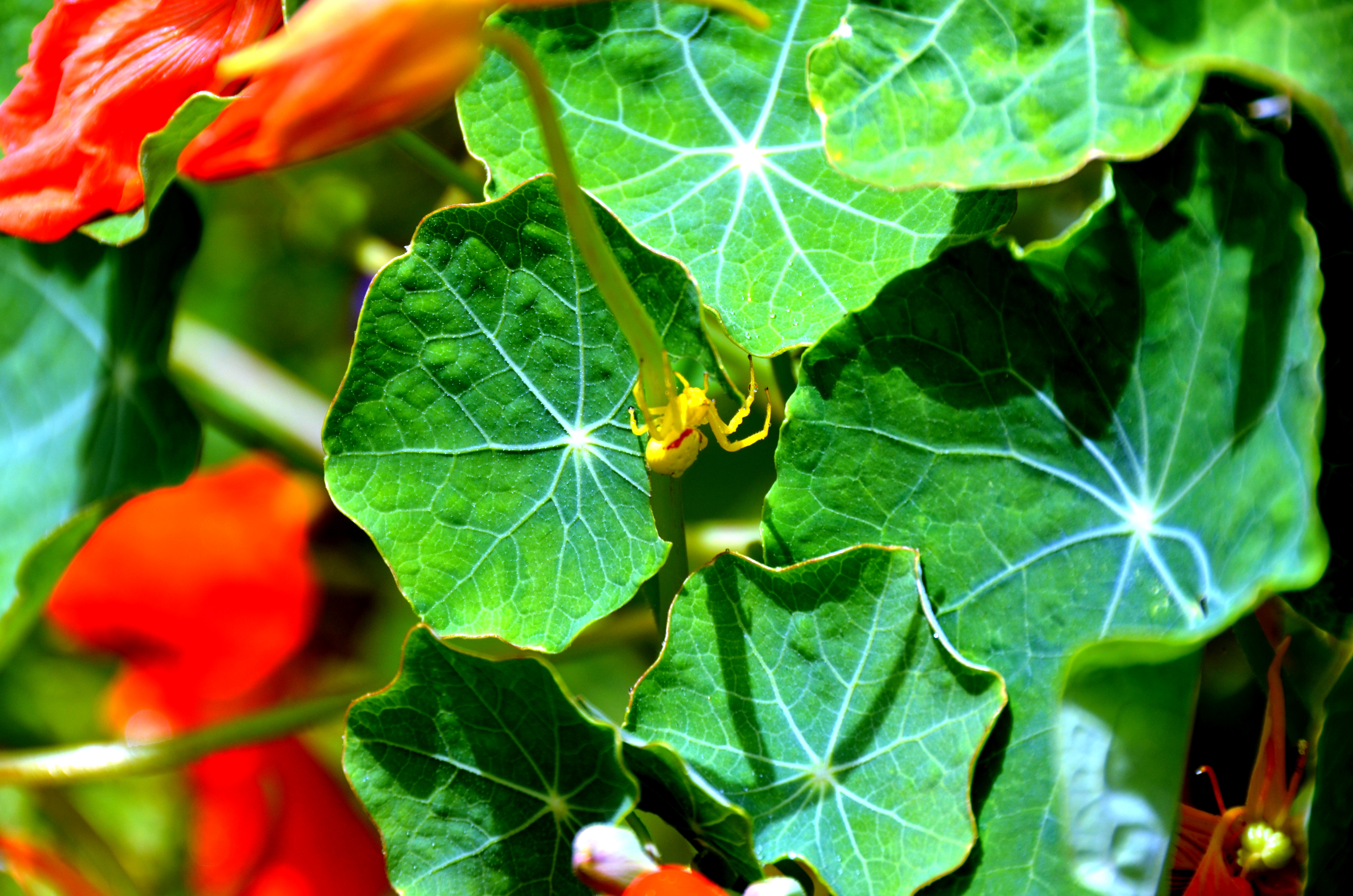 Another first for the backyard nasturtiums yesterday–a Goldenrod Spider was about. I read that this spider changes colors–from white to yellow–to camouflage itself.It seems it would be harder to see it if it stayed white.
