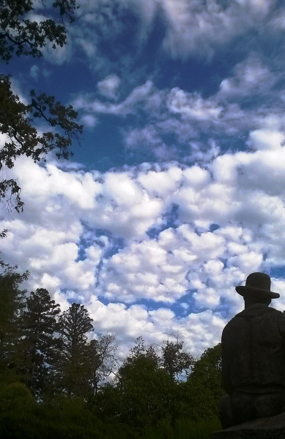 Took this photo with my cell phone this morning of the clouds over Sacramento as seen by the “Charles Swanston” memorial statue in Land Park. His son, George, commissioned the work, erected in 1924, to honor his father, a rancher/land developer, as well as the pioneers who settled this Gold Rush area. Charles is looking West.