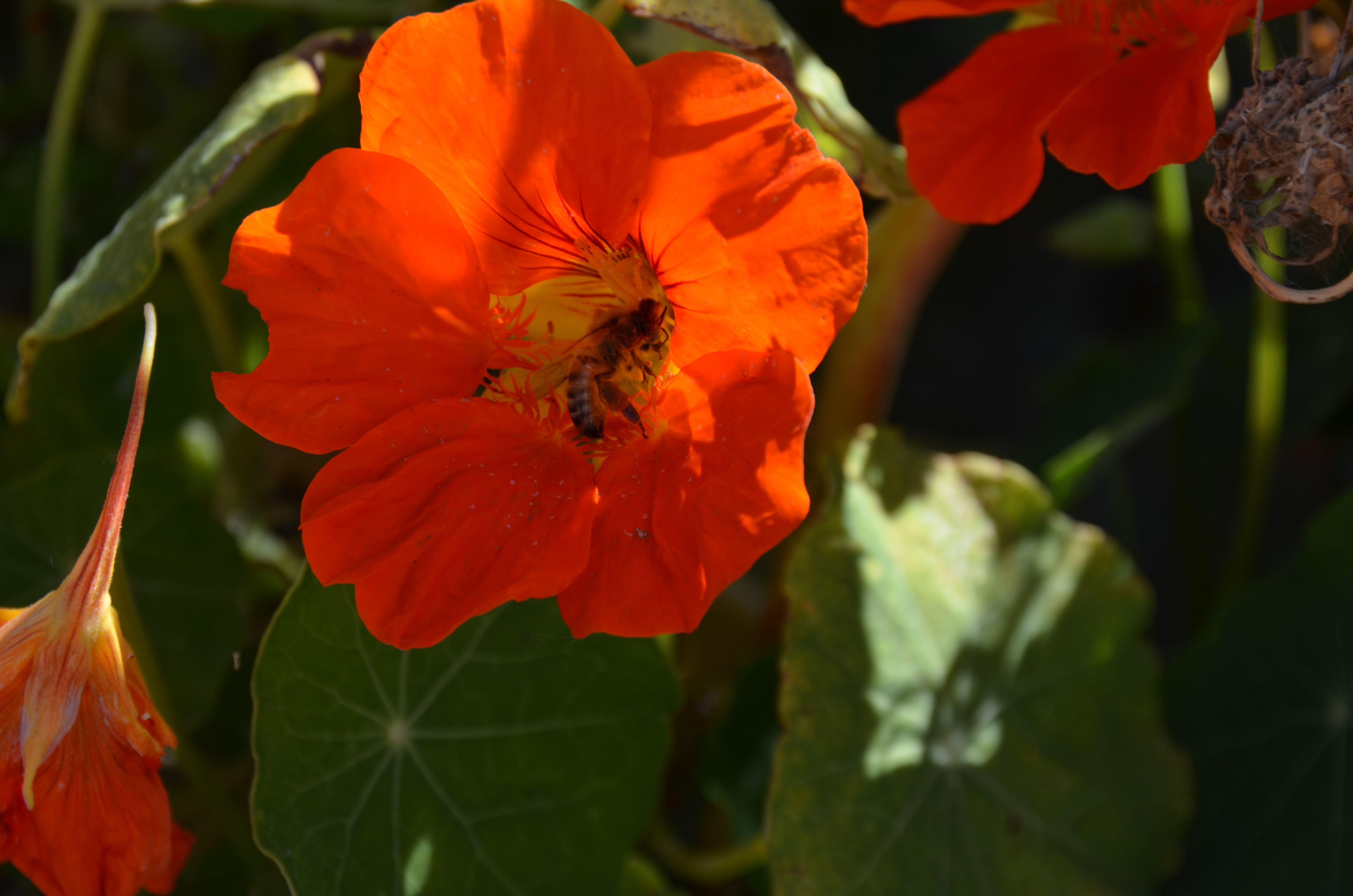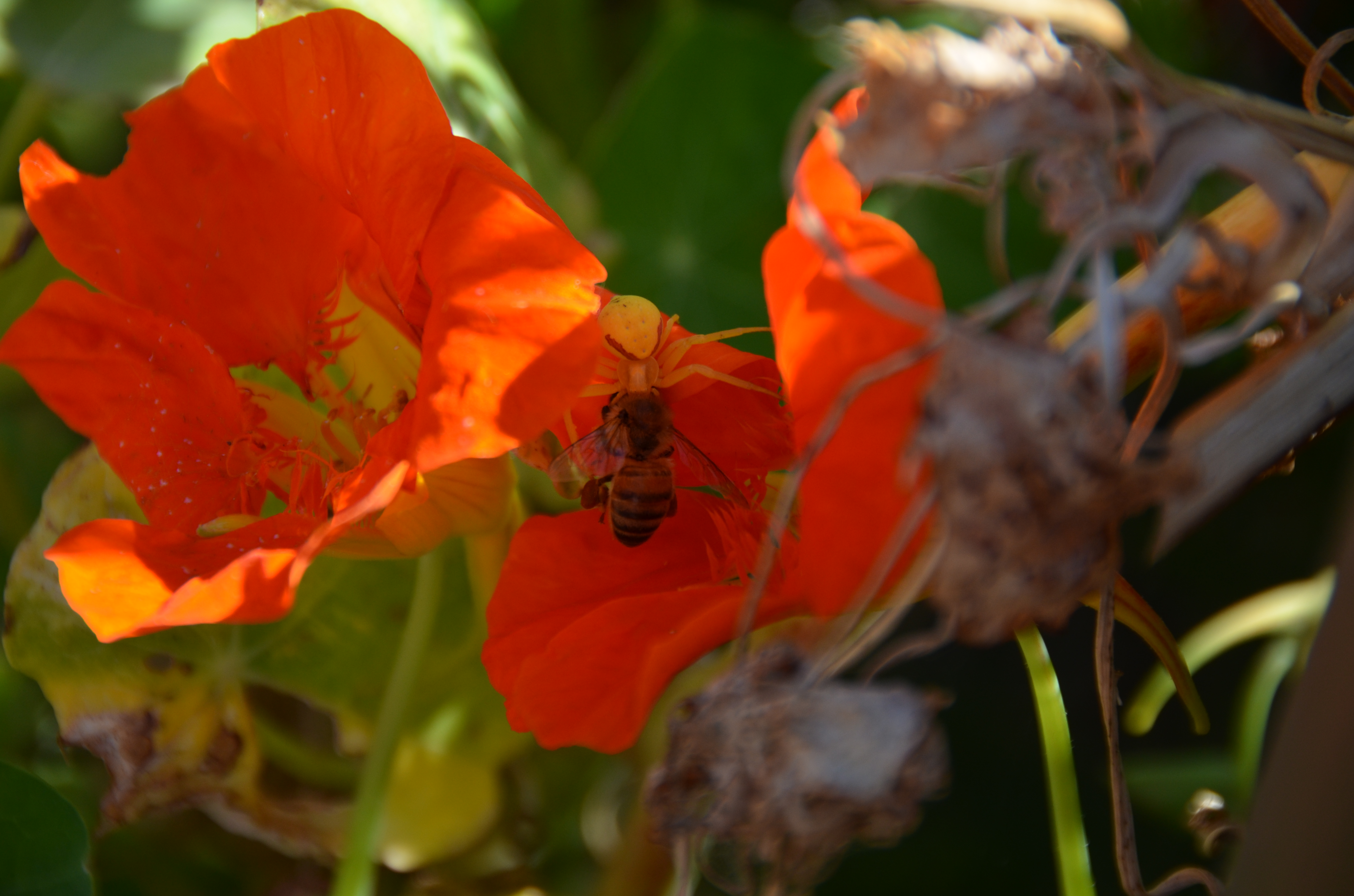 Last week I posted a bit about how the Goldenrod changes color from white to yellow to hide itself from prey. I remarked that the spider was easier to see when it was yellow. But then I saw one of my honey bees asleep in a nasturtium. Weird. I lifted it up with small knife only to find that a Goldenrod was attached to it; i.e., it paralyzes its victims before sucking out the fluids. The yellow spider is the same color as the inside of the nasturtium. Got it. I took care of the spider and hope not to see any again.