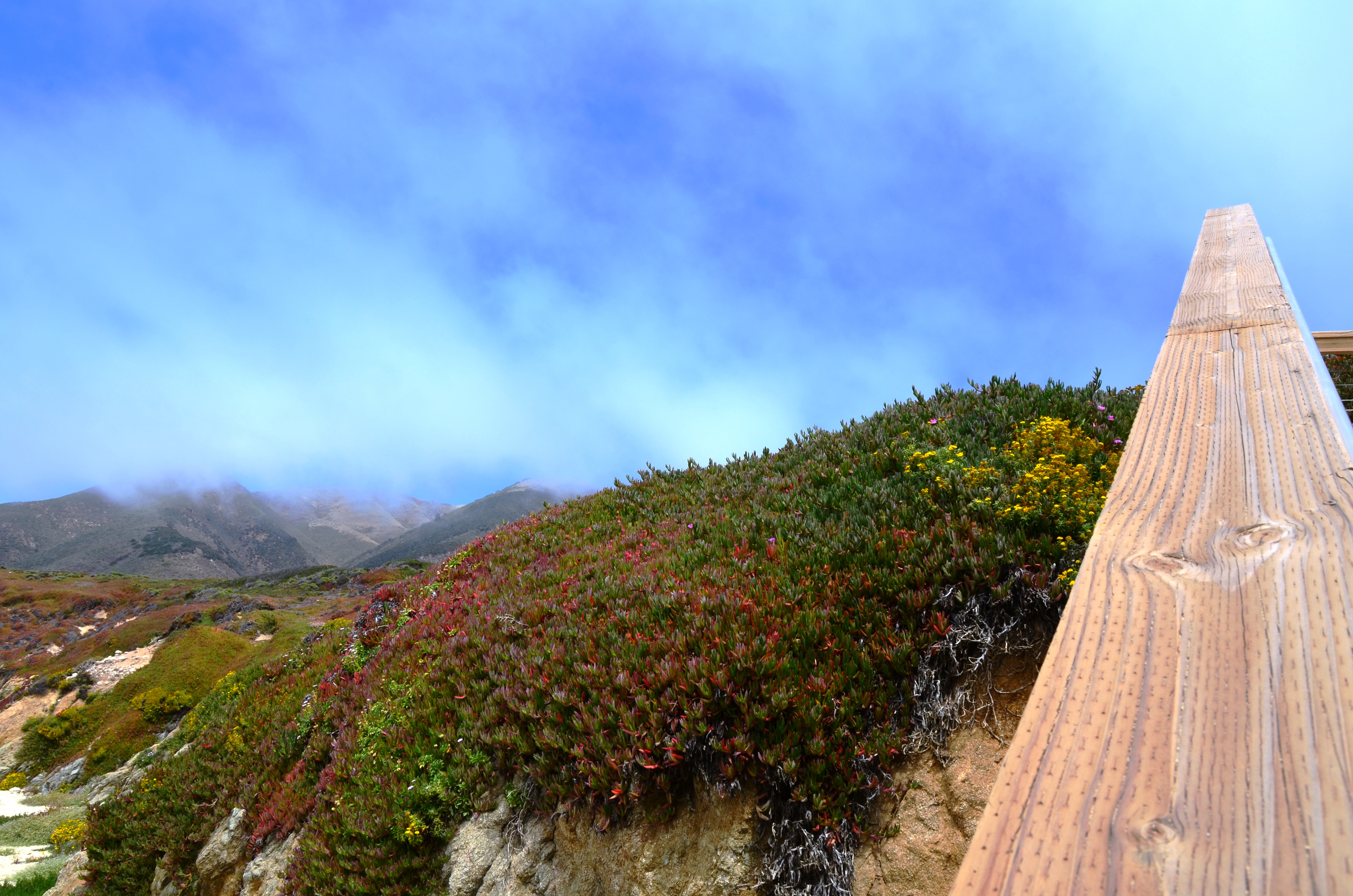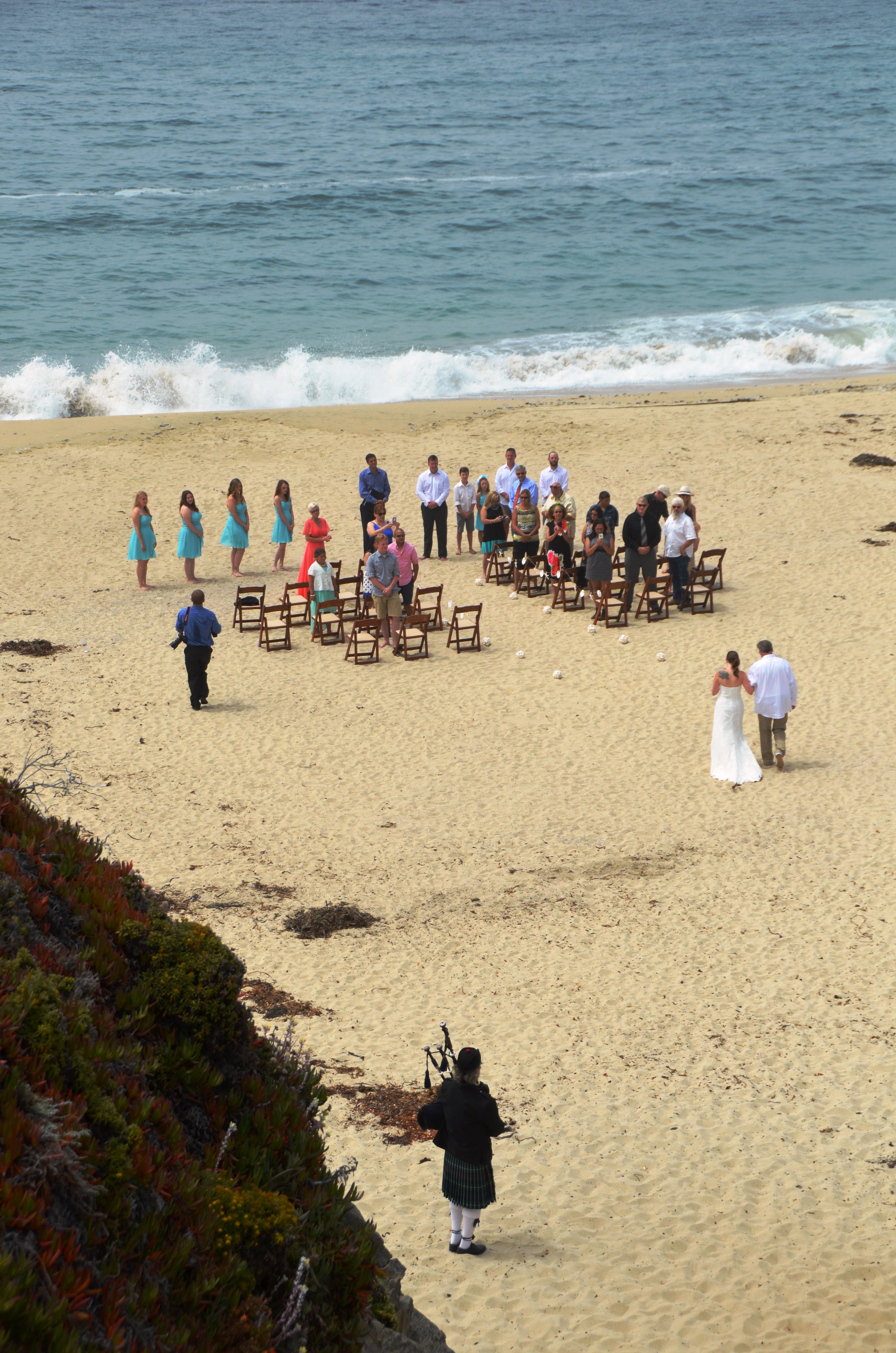 I used a redwood handrail at Big Sur’s Garrapata State Park to accentuate the light fog drifting in from the hills above. I did a 180-degree turn to capture a midweek wedding below. The bagpiper was a nice touch.