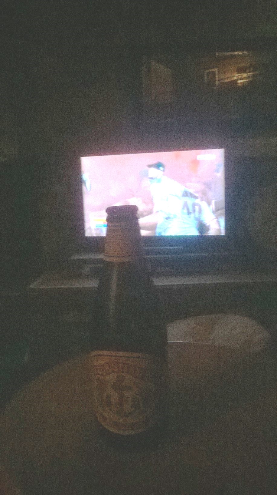 Anchor Steam in my living room while watching MadBum win again, making the Giants World Champs for the third time in five years. Whatever it takes!
