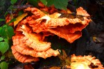 These chicken mushrooms were growing on a fallen tree in a dense forest. When found on a dead conifer, the mushroom is poisonous. This mushroom wasn’t on a conifer–but I passed.