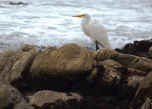 . In brief, I would get about 30 feet from this egret when it would escape to a nearby rock, but always one that was within this 30-foot range–most egrets would fly to a rock further out in the ocean. Finally, after the egret ended up sharing a spot with a sea gull, I left.