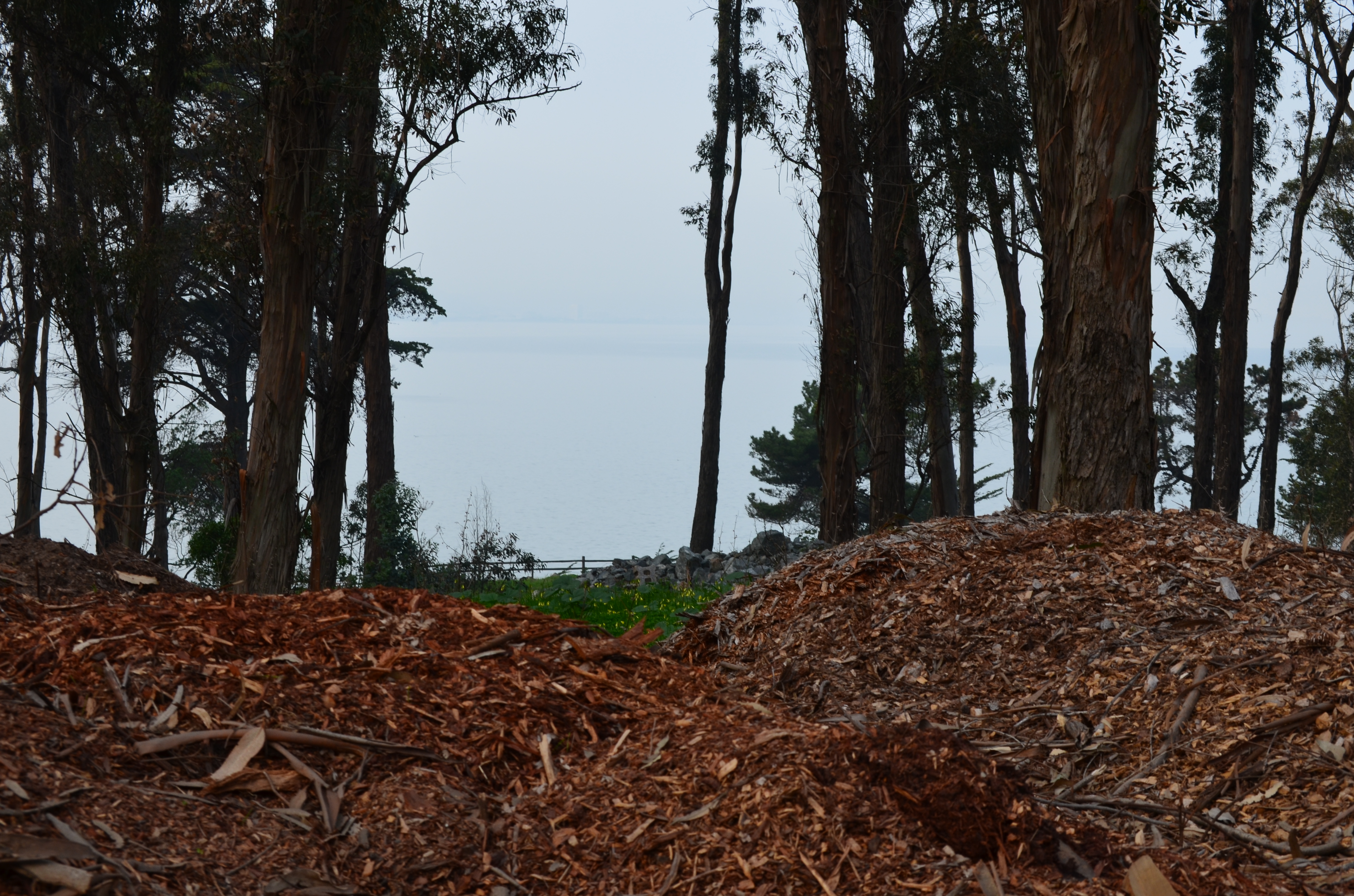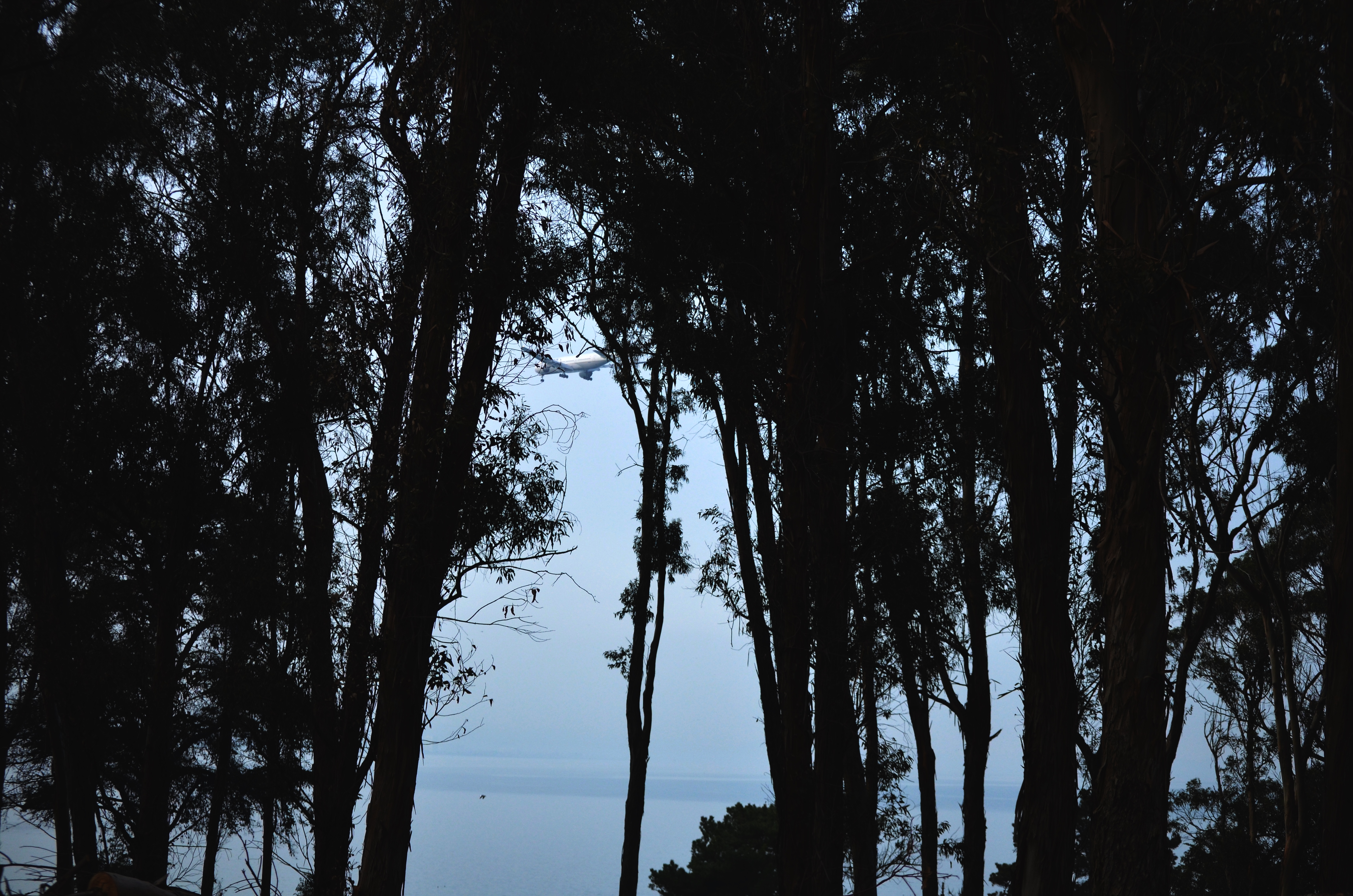 I was at Coyote Point, San Mateo, California, yesterday for work. I took a shot of a jumbo jet (top center) flying by the eucalyptus trees on its descent to San Francisco International Airport. Not shown was the smell of menthol cough drops