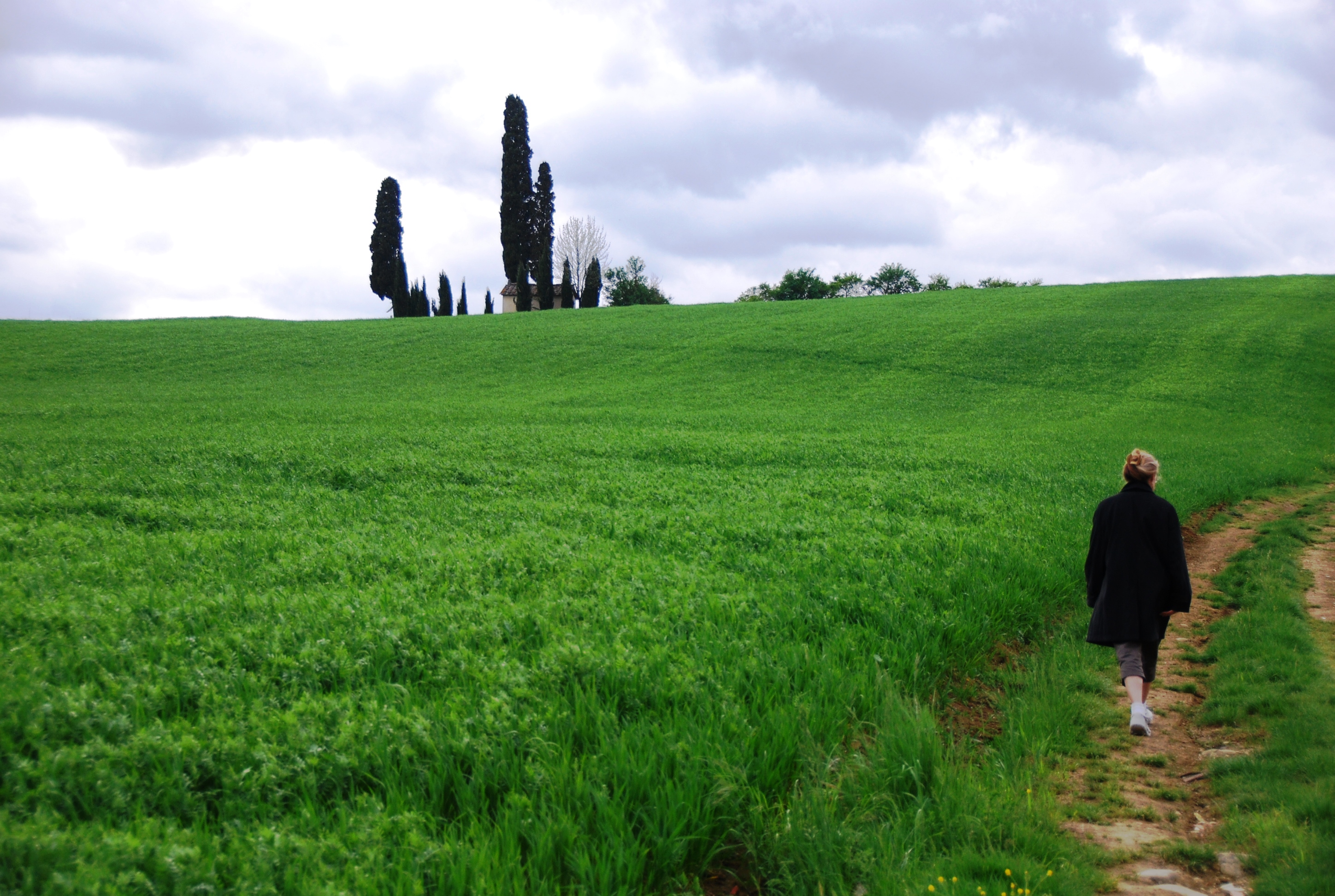 The walker (Anne), the grass and the skyline fit the rule of thirds. What I like most is that the dirt road turns away from the house and, therefore, make us wonder where does it go? Perhaps, it leads to a villa that is not shown. The walker is headed off the frame and that gives motion to this simple photo.