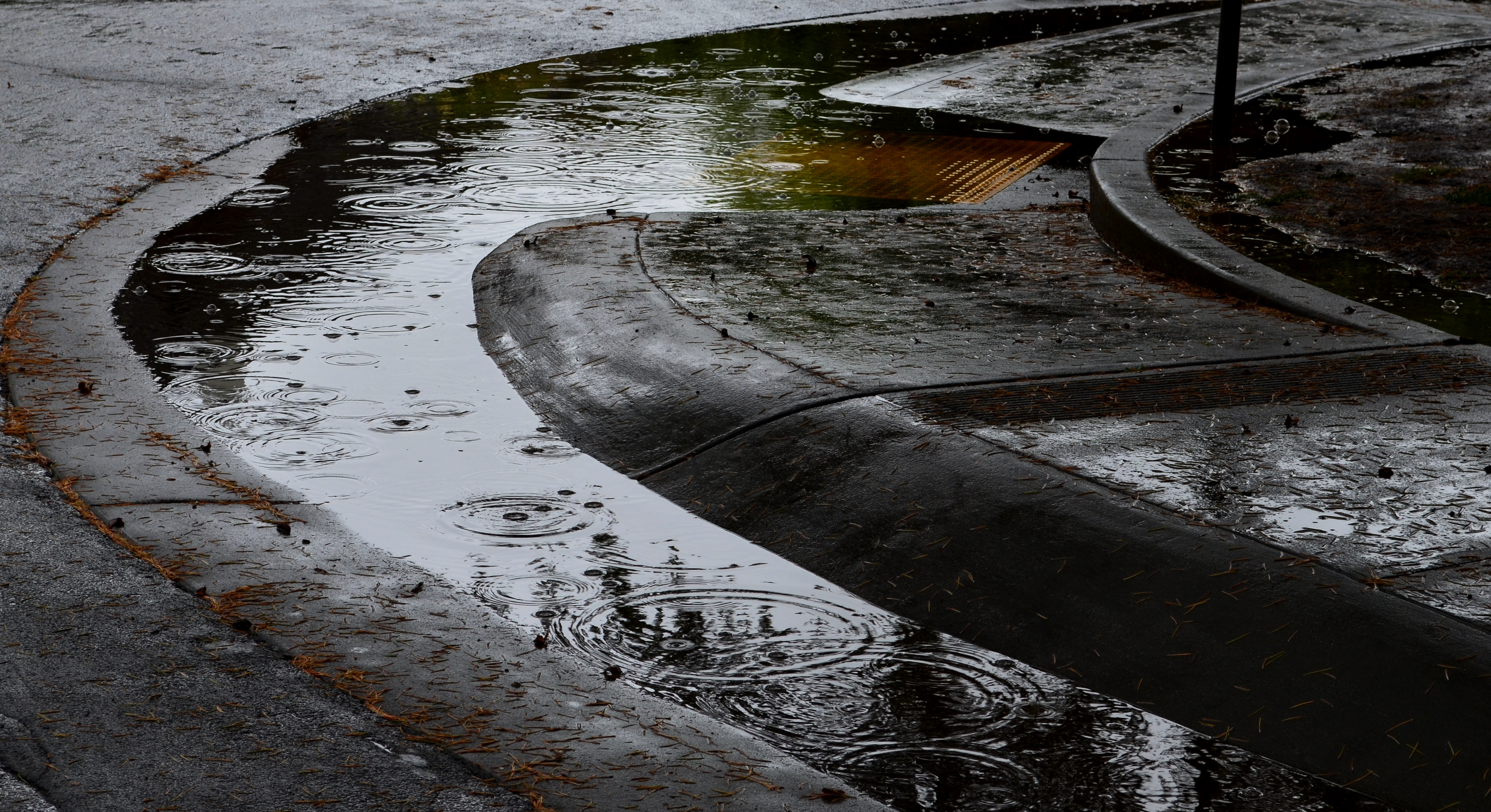 I’ve missed the look of clogged gutters on California streets. This morning they returned briefly for what the weather people say will be a rain with “minimal effect” on the drought.