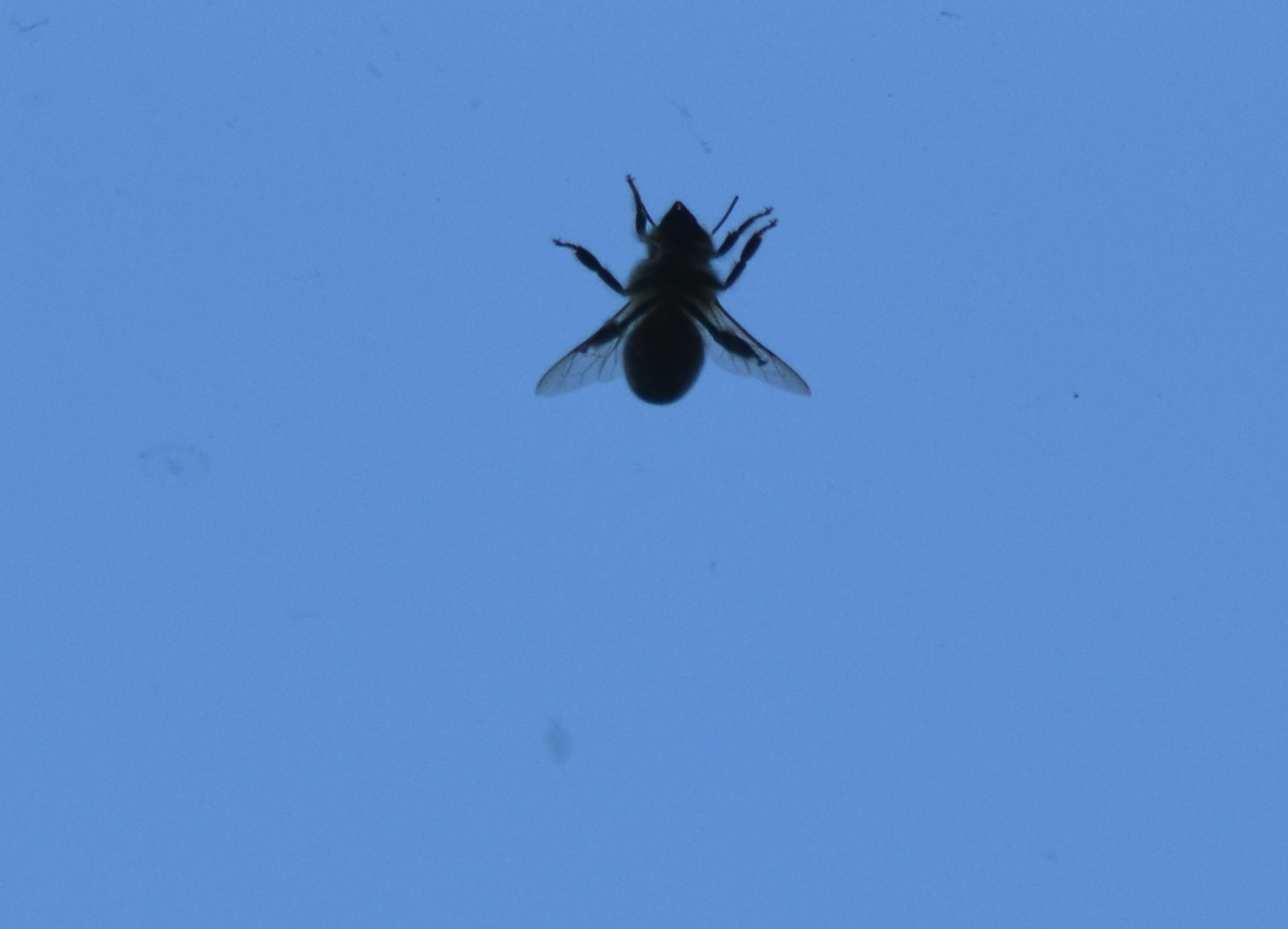Since I’m a beekeeper, I sometimes find that a bee’s final resting place is a window. I took this shot from the inside on a sky blue day–the bee is on the outside.
