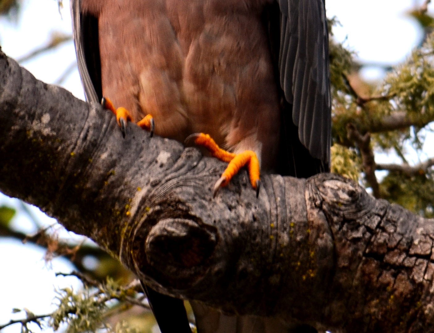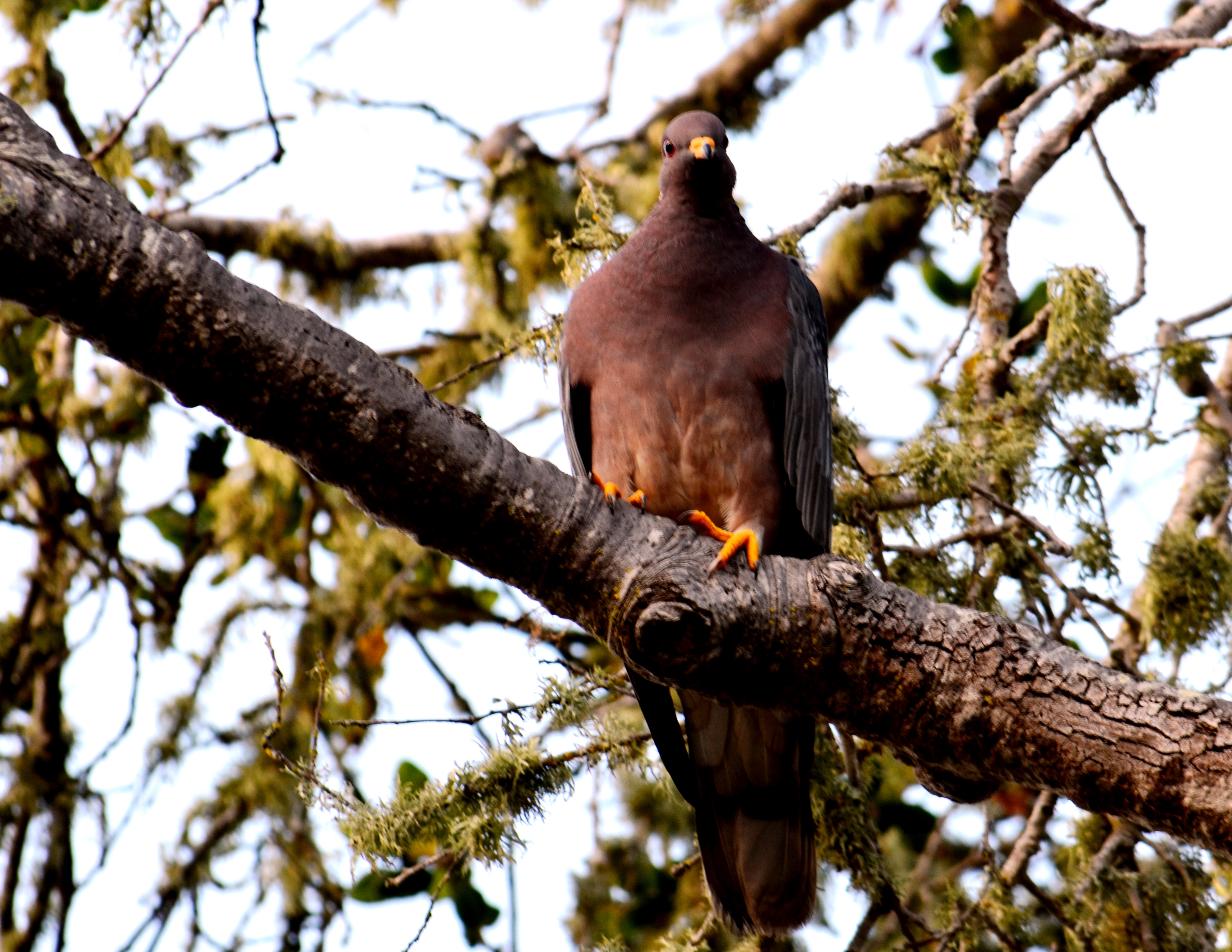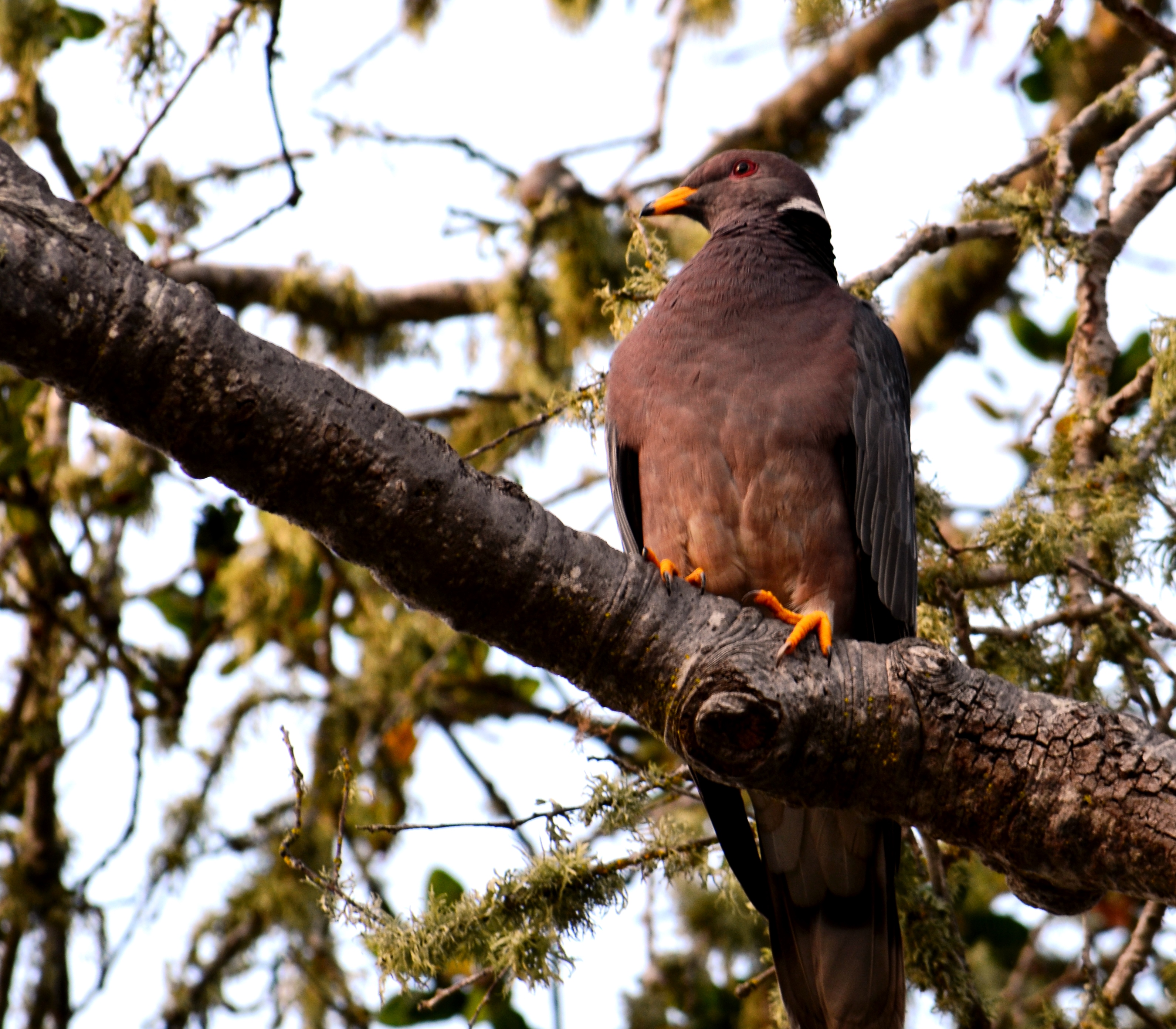 I went to take the garbage out this week when I was stopped short by a very large bird on a branch over the can. I carefully put down the trash and grabbed my camera, hopeful the bird wouldn’t hear me. But one click of the shutter was all it took to be noticed. Turns out this was a band-tailed pigeon, the largest of all pigeons in North America, weighing about 18 ounces. I’d guessed ten pounds–I mean, look at those claws.