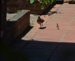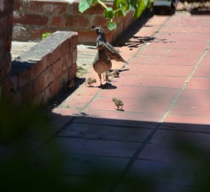 It was one of those nothing going on mornings in California when we spotted two adult quails with nine babies. This sighting isn’t unusual, but the state birds were on our “patio” which is the domain of our three dogs. Luckily the dogs were inside. For the next half-hour we waited for the family to walk away. Finally, they left as they had come–through an opening in the front gate. Next, we let the dogs out and had coffee.