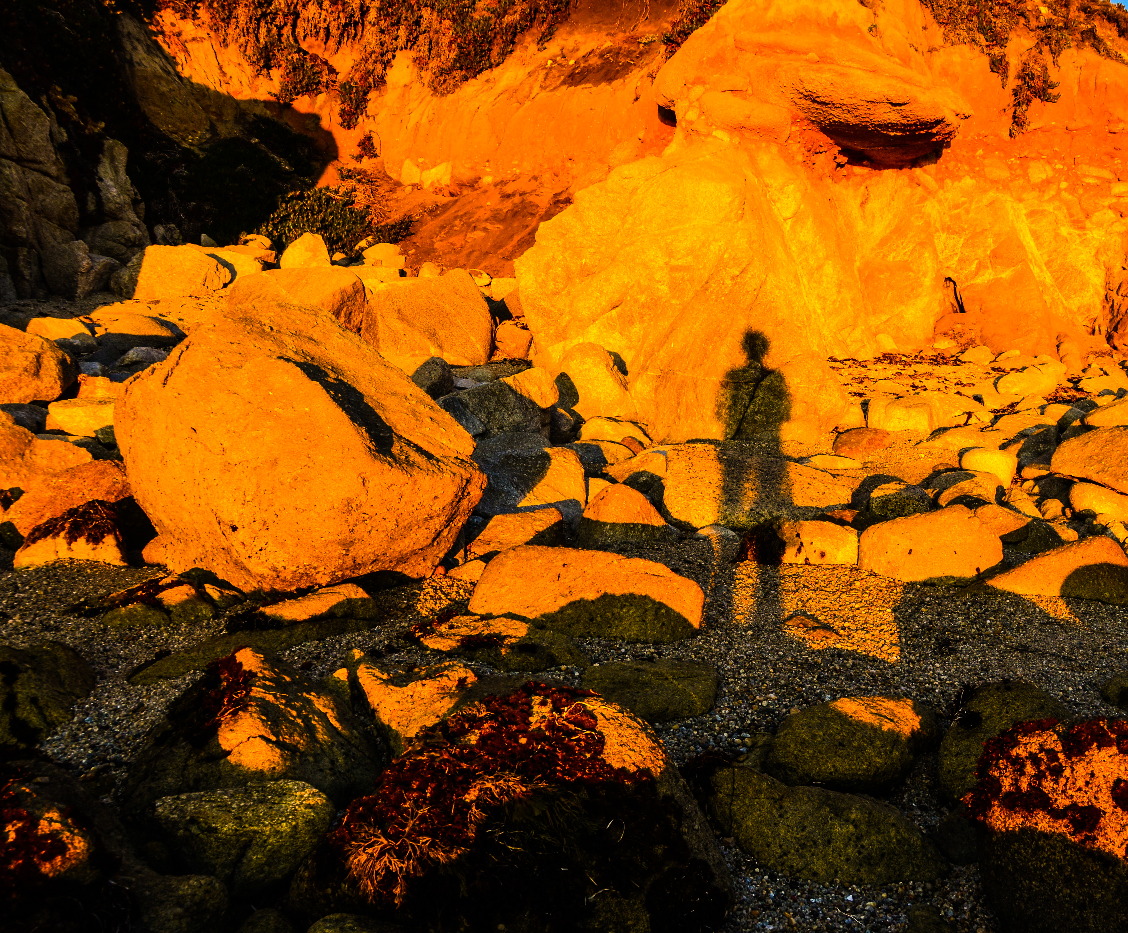 This week I stood with the setting sun at my back on a postage-sized beach near my house and a camera held at my waist. Click!. I like the detail of the rocks in the shadows and the boulder over my left shoulder appears to have a watchful eye on me. This is my Rorschach test.