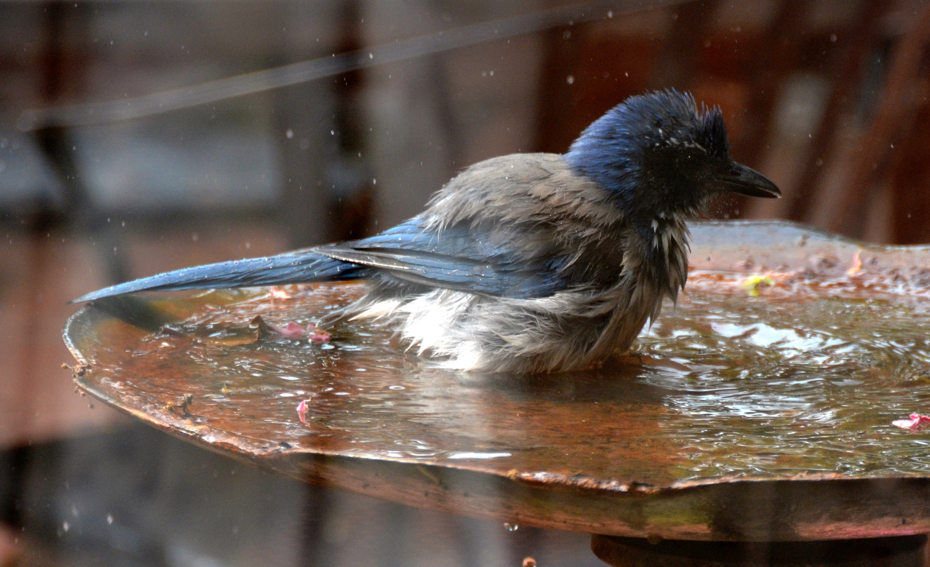 The water in our bird bath doesn’t last long. I assumed evaporation was the cause until I looked through the window this week to see a blue jay engaged in one wild birth bath. These shots were taken through a window.