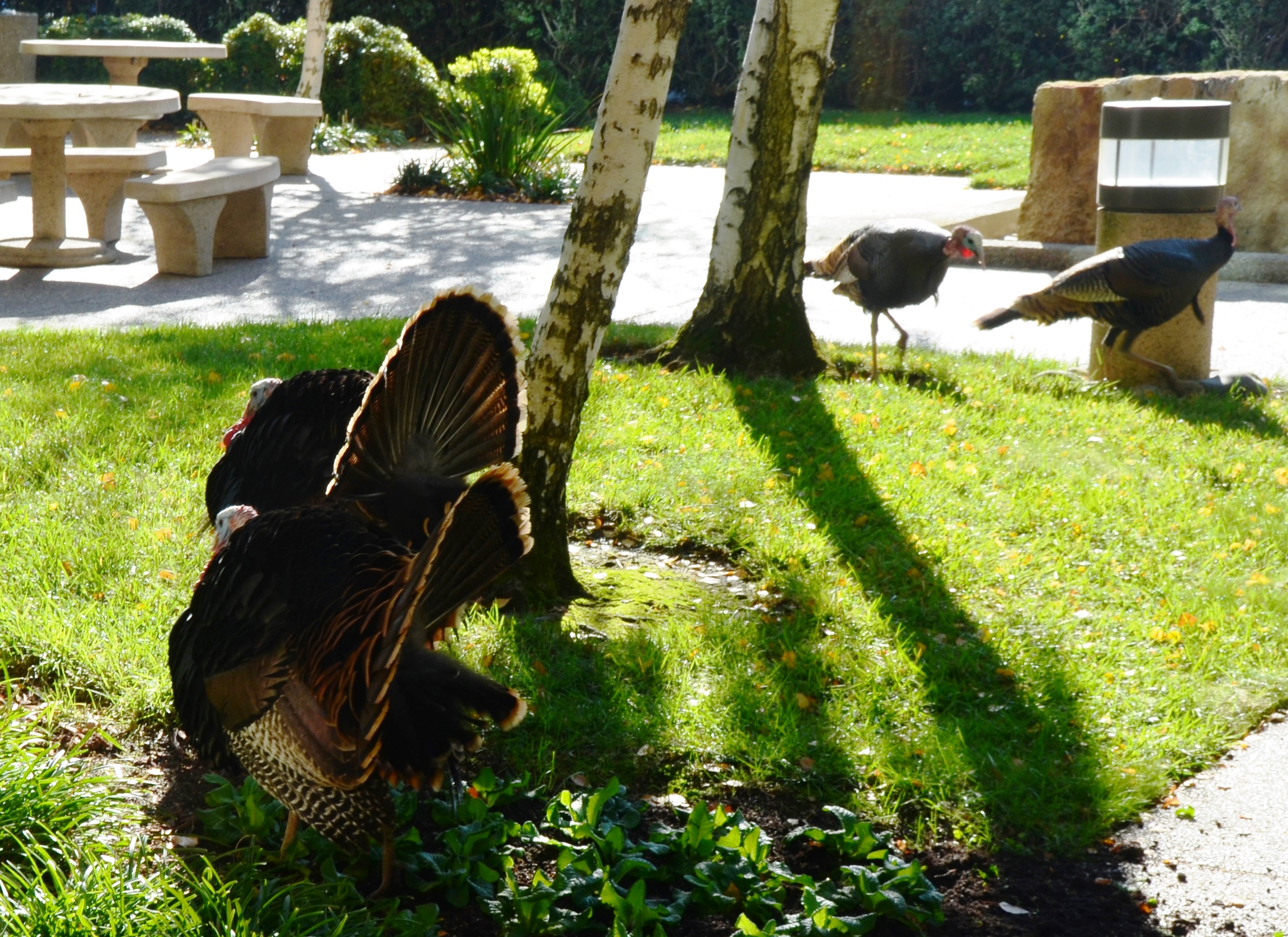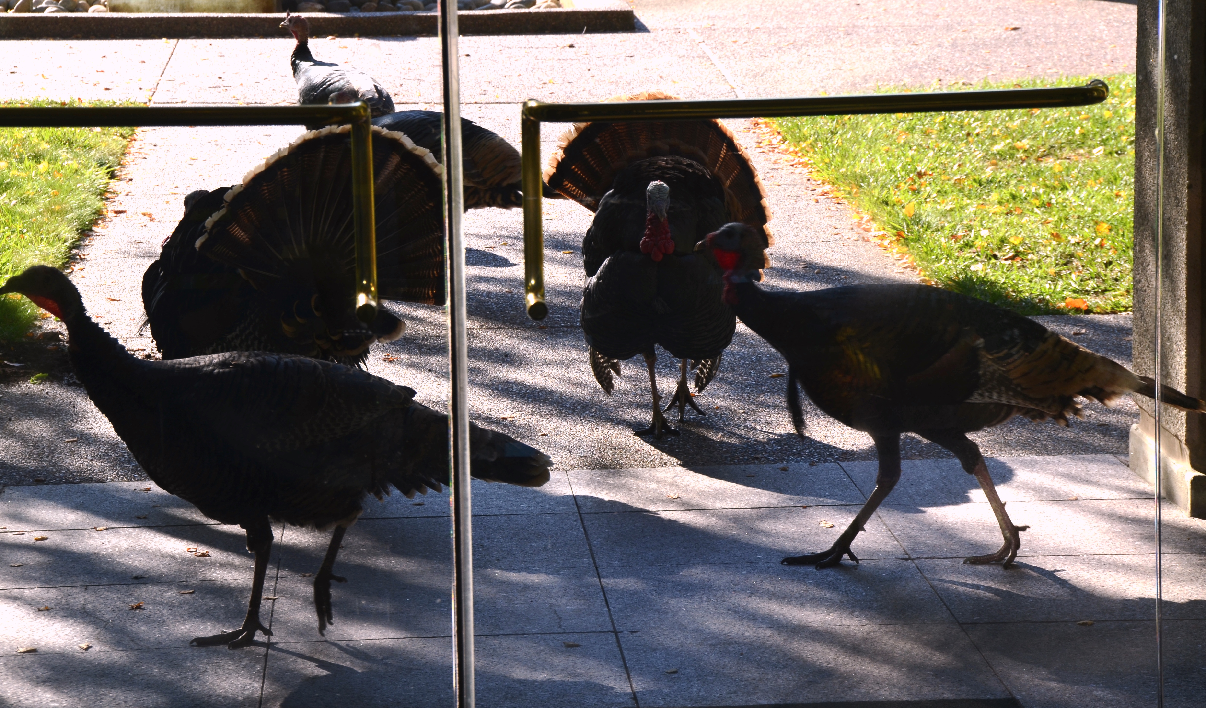 I went to a meeting yesterday morning in a Sacramento office building. There was a coffee vendor in the mezzanine and wild turnkeys by the entrance in this metropolitan area of over one million. One expert by the elevator said it was the first frost of the season, so the turkeys were probably drawn by the heat of the building. I assume they “live” along the heavily wooded banks of the nearby Sacramento River, or else downtown somewhere.