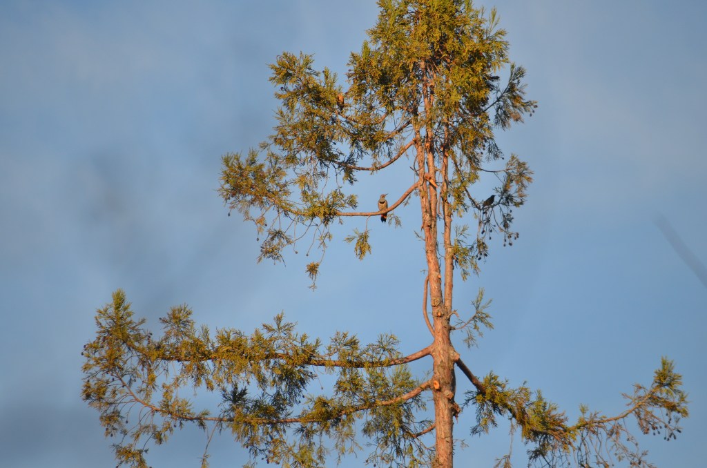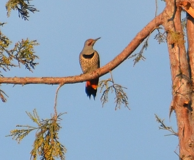 The tallest tree in the area is about to come down for a variety of reasons. I was looking at it from afar when I saw a large bird land on an upper branch. After I enlarged the telephoto shot, I was stumped by what I was looking at. Anne identified it as a Northern Flicker, a woodpecker known for eating ants.