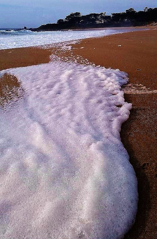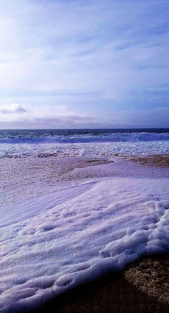 Turbulent ocean waters deposited large amounts of sea foam yesterday on Carmel River State Beach. That’s the easy part–harder, at least for me– is explaining how sea foam is formed. I could cut and paste from Wikipedia, but I’d rather wing it with my version. Dissolved organic matter in the ocean can become a foaming agent when seawater is agitated by breaking waves. Or, the ocean is a giant washing machine with many additives, some that foam like detergent when agitated. Whatever, the waves were fast and furious, hence, the beach was covered with foam. The largest waves of the year are expected January 20 and 21 and, I assume, sea foam will be everywhere.