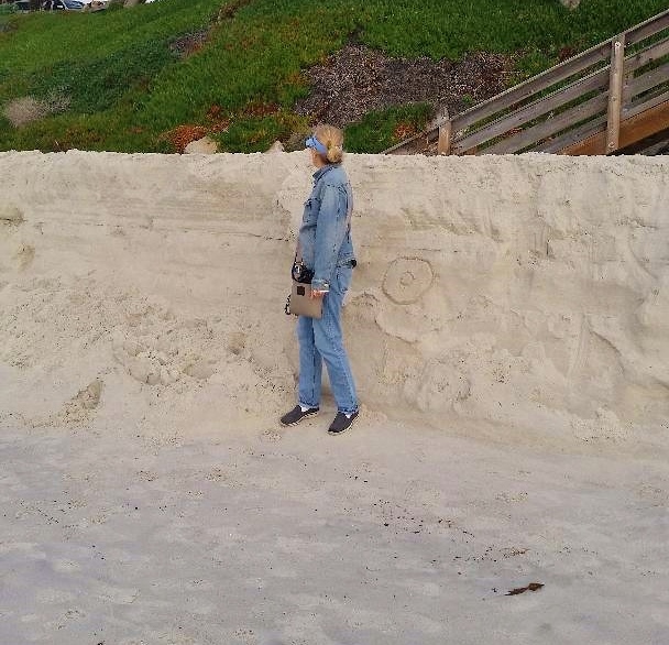 The onslaught of pounding, high surf for the past month has reconfigured the famous Carmel-by-the -Sea beach. Sand is missing, or rather it has been repositioned. Anne is looking back at the wood stairs that are, as usual, even with the beach. However, after walking 25-feet from the stairs, there is a drop of four feet instead of a gentle incline to the ocean. Rocks are exposed that were once covered by white sand. As Anne demonstrates, there is still a beach, although less of one in terms of depth. The sand bank is a natural protection against further erosion.