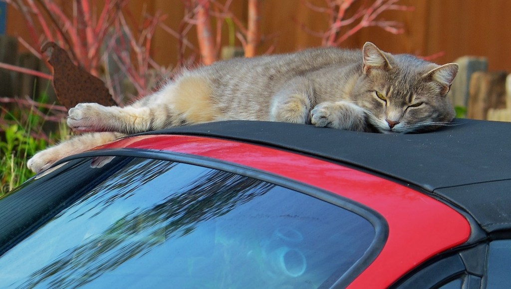 I’ve been squeezing dog walks in between the wet weather. Yesterday’s trip led us past a cat sleeping on the soft top of a convertible sports car. With two dogs on leash, I took this shot using a telephoto lens. Luckily, the dogs never saw the cat.