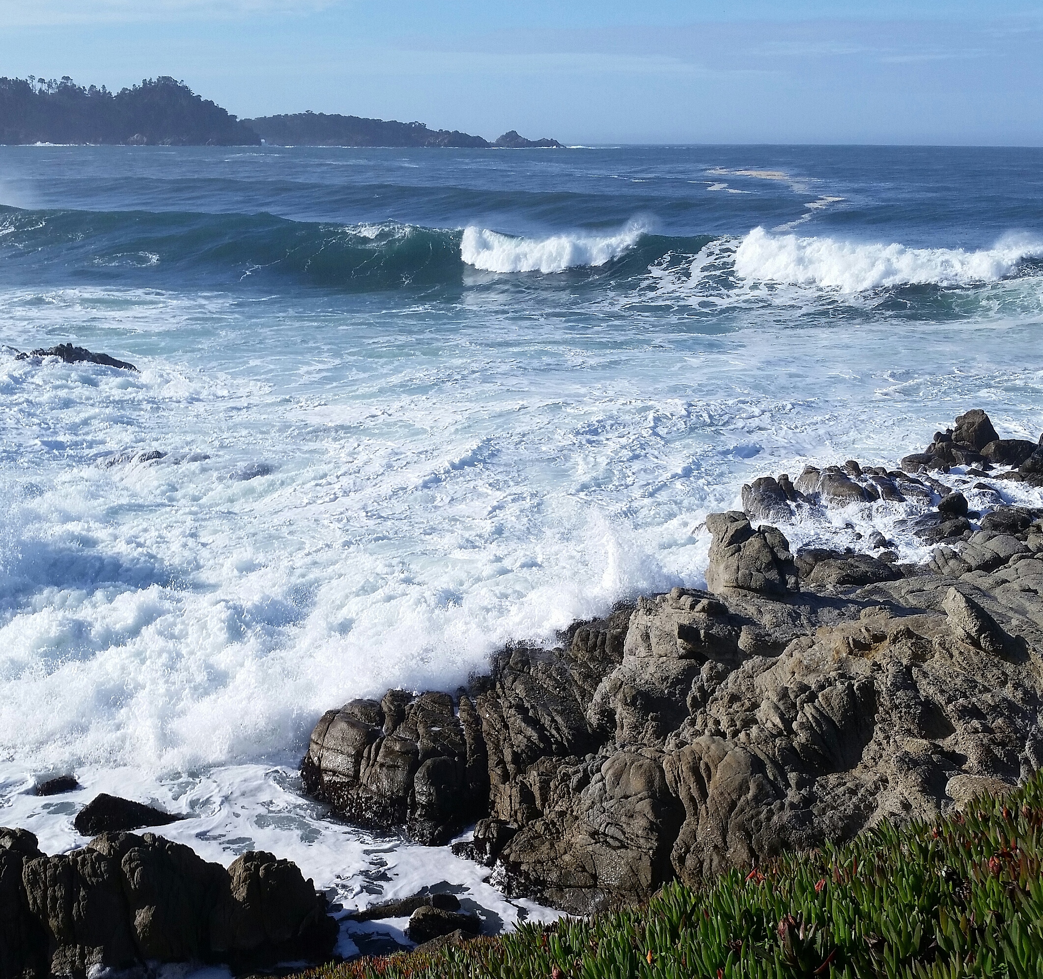 After a week of rain we had clear skies yesterday. I took these shots with a cell phone held in one hand while the other gripped two leashes holding dogs that wanted to move on. My goal was to not fall off the cliff. Success.