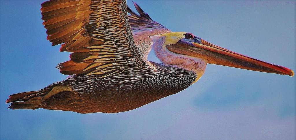Every year I take hundreds of photos of pelicans. I like how they glide along the coast in formation, or dive into the ocean for food. In the majority of the shots, this big bird’s colors are dull, chiefly due to lack of bright light to accentuate the various hues of the feathers, neck, head and beak. Here is one of my few captures of a pelican flying on a sunny day. The result doesn’t look real.