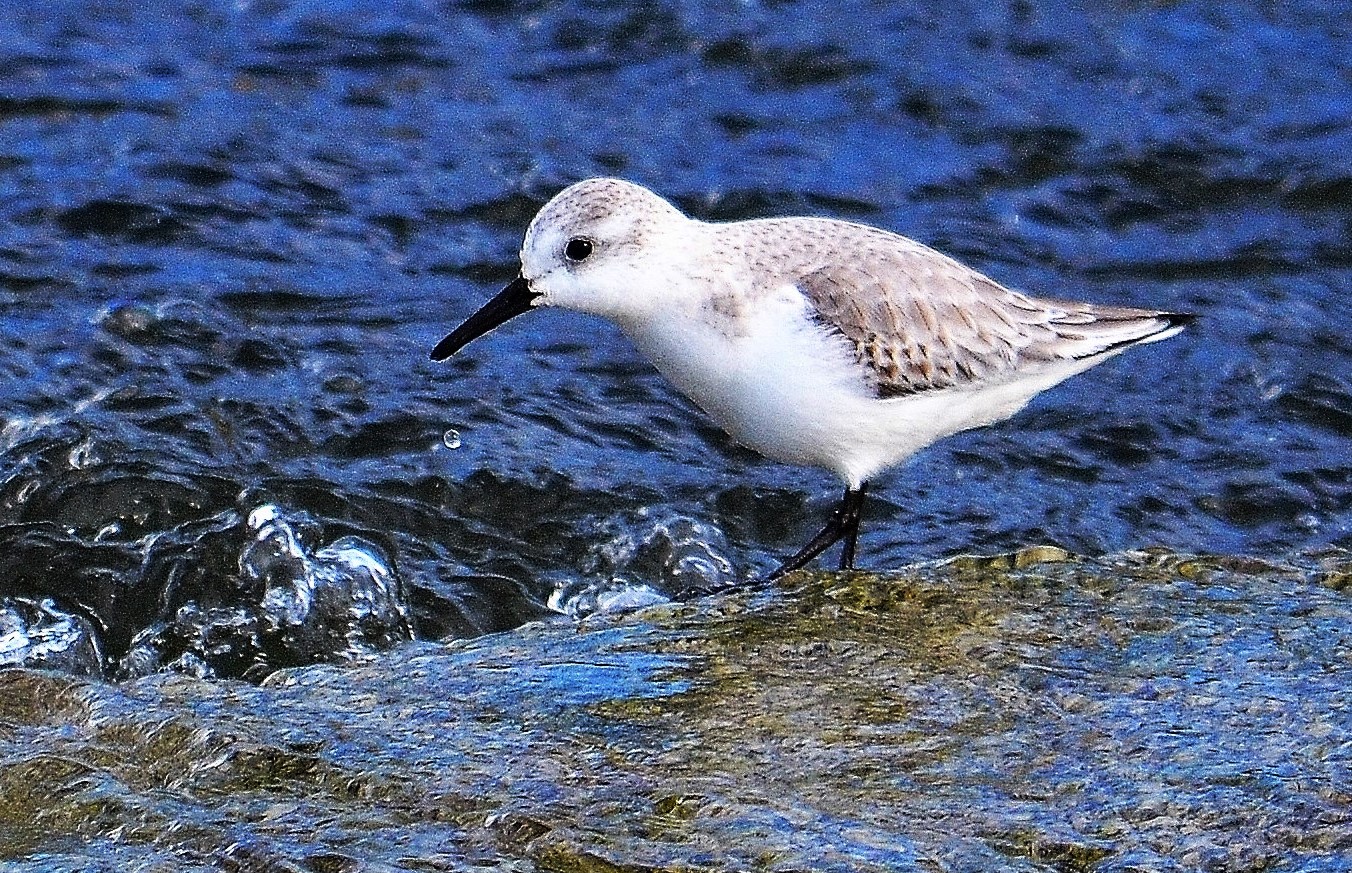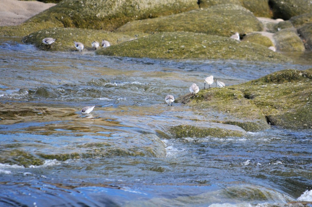 To prevent flooding and help spawning fish during the rainy season, bulldozers cut a channel to allow the Carmel River to flow into the Pacific Ocean. The result is a rushing river that doesn’t bother the sanderling. These shore birds stand confidently on slippery rocks while combing the water for food.