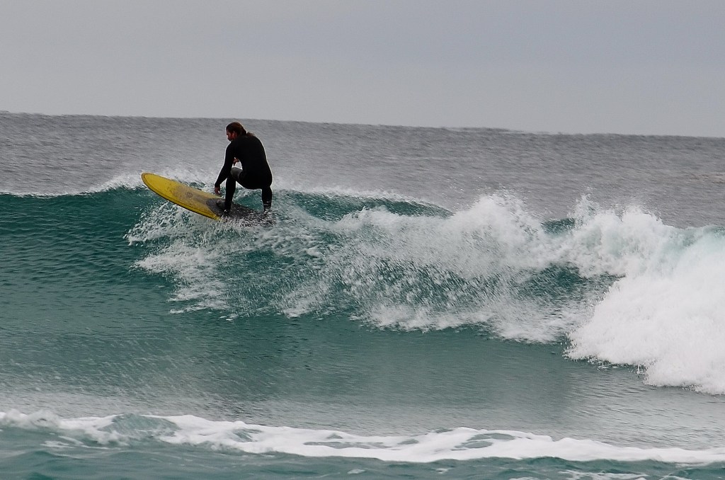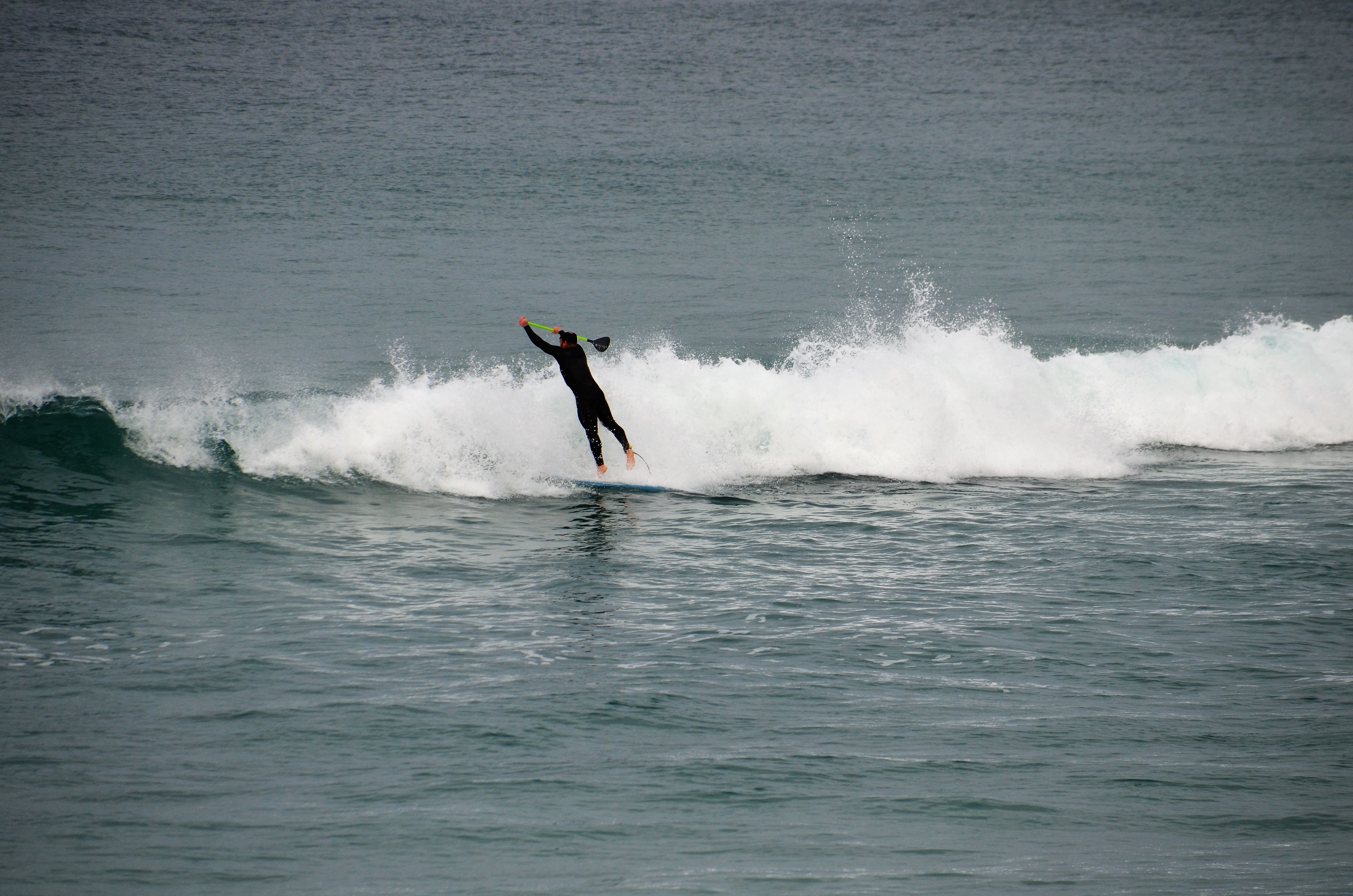 A surfer does well catching a wave yesterday while a paddle -boarder has no choice but to bail. A few hundred yards away celebrities and pro golfers could have used wet suits as rained pelted the Pebble Beach Pro-Am.