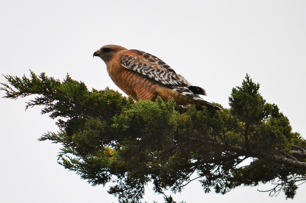 People tend not to look up. This habit explains why the spectacularly colored red-shouldered hawk went virtually undetected on a busy Carmel street yesterday. This bird was perched near the top of a tall fir tree, but easy to see from the street. In my opinion this hawk is more orange than red.