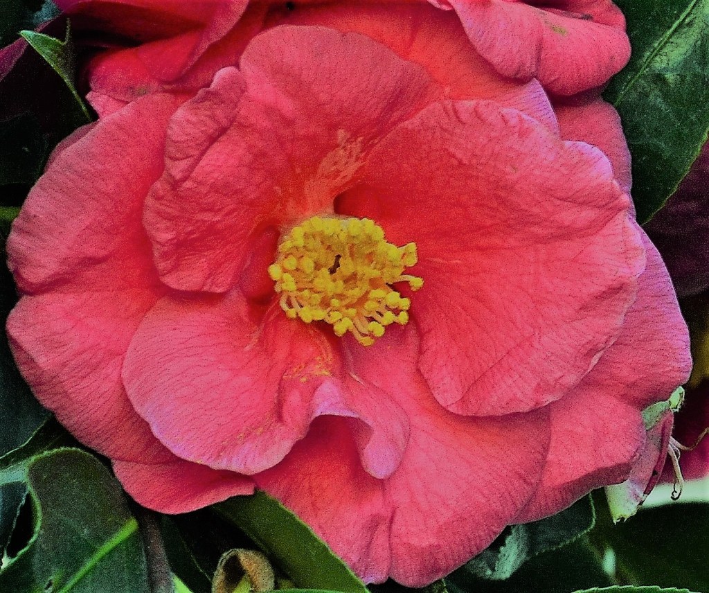 For over 150 years the camellia has been celebrated in California’s state capital , Sacramento, in February and March. But these are rain months, typically subjecting the blooms to a pelting that softens the petals. Still, these rain soaked flowers have showcase beauty on the stem although they fall apart if picked. Hummingbirds and honey bees love the yellow center.