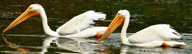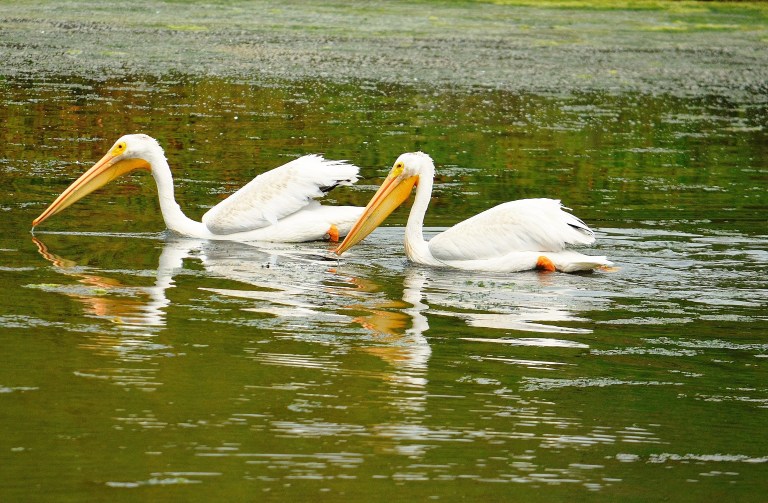 The American White Pelican is big with a 9-foot wing span. Unlike the smaller brown pelican, it doesn’t dive for food. If you look closely at the photo, you’ll see water spilling out of the bird’s beak, the result of thrusting its head underwater in search for a meal.