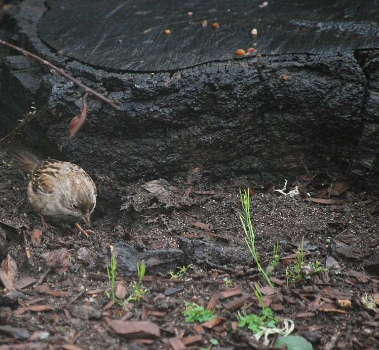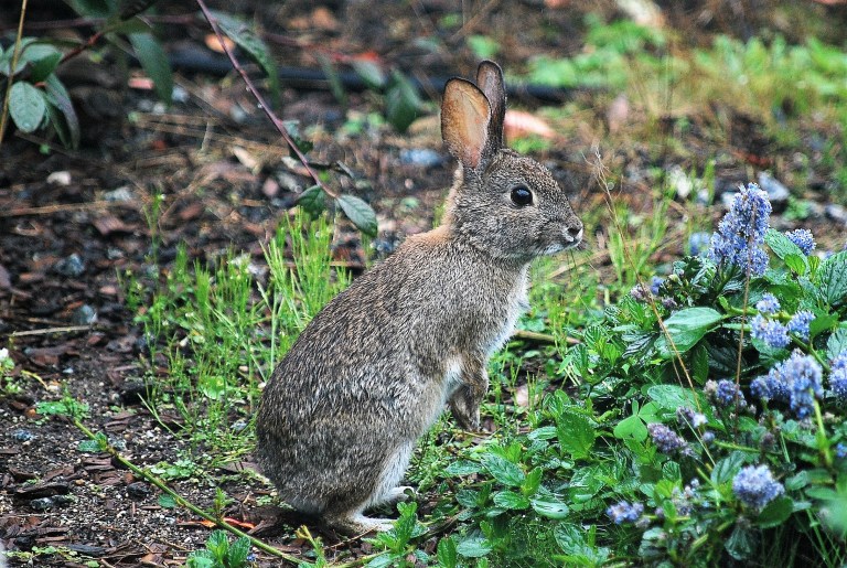 A wild rabbit has been living in our front yard for five months. After a break in the week long rain, it came out yesterday to pose for this shot and, of course, to eat. The rabbit was joined by a dozen or so sparrows pecking the ground. I’d say the time after it stops raining is a wildlife photographer’s “golden hour.”