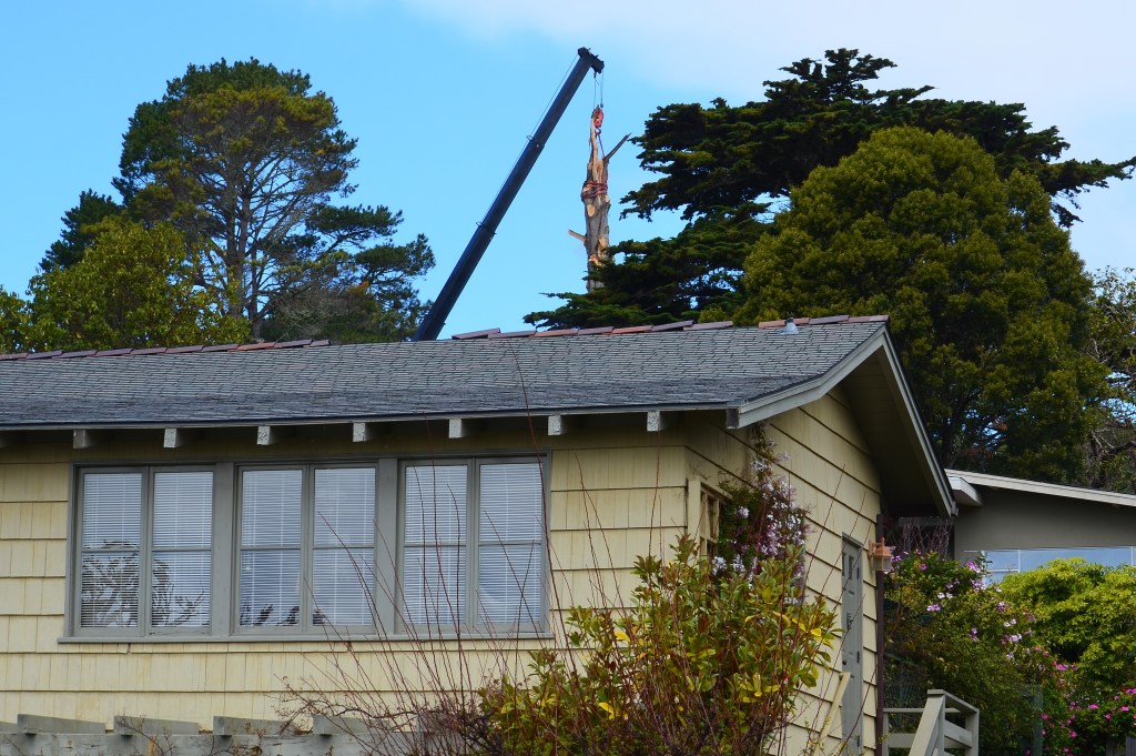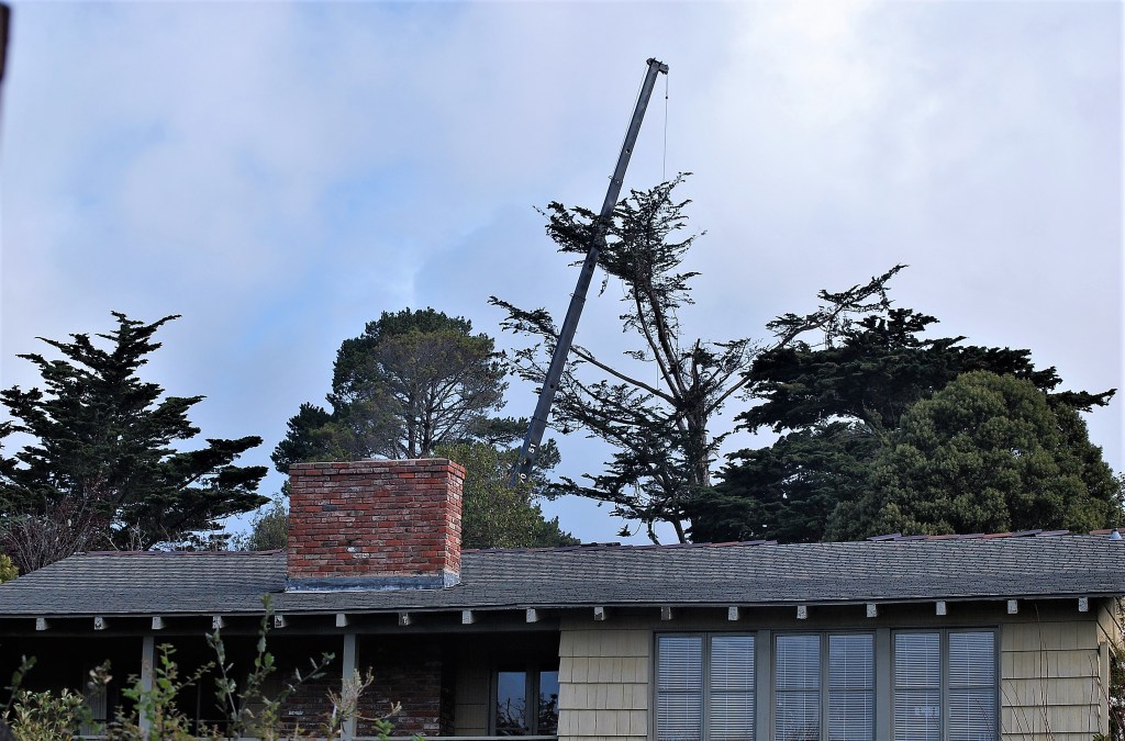 Actually, the crane was in a neighbor’s tree that had been damaged in the recent storms, These two photos were taken an hour apart yesterday. Unfortunately, men with chain saws in trees is a common sight in Northern California–the presence of a crane is less common. However, we had the crane in our tree 4.5 years ago. Climate change is real.