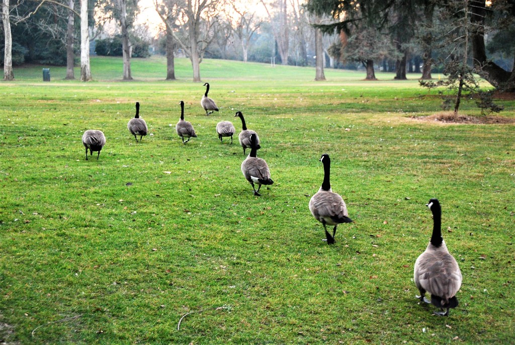 Canadian geese in a Sacramento park walk in a “rough” vee-formation before taking off to overnight at federal marsh lands about three miles away. The geese go through this ritual every day about 30 minutes before sunset.