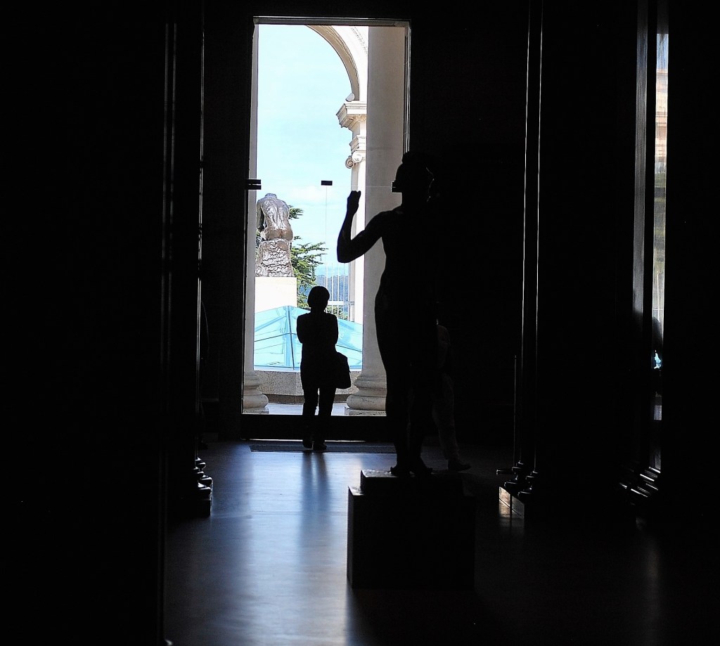 A woman strikes a looking pose with Rodin sculptures in front of her and behind. Photo taken at the San Francisco Legion of Honor.