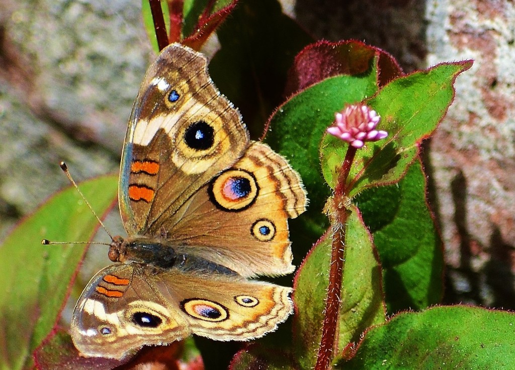 It is called the “common buckeye,” but the color on this butterfly’s wings is anything but common. Took this shot in our yard where we see buckeyes during the first half of the year. Count the wing colors: orange, blue, black, yellow, white, red, pink and brown.