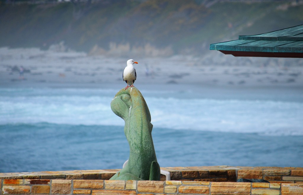 One day in June each year in Carmel, the public has an opportunity to tour one of the most exclusive homes in America: the Frank Lloyd Wright designed Walker House. I’ve never been inside, although I often walk past it. And each time I do, I see sea gulls looking as if they own the place. In particular, they enjoy the sea nymph statue on the patio that juts out as if it is the prow of ship. They also leave their calling cards.