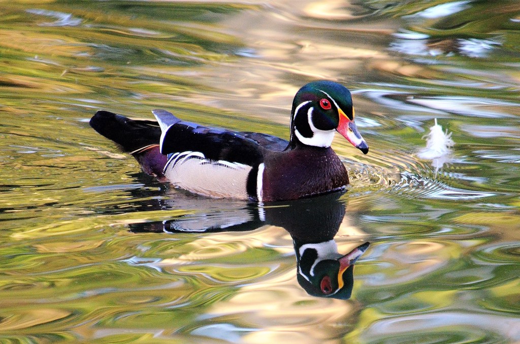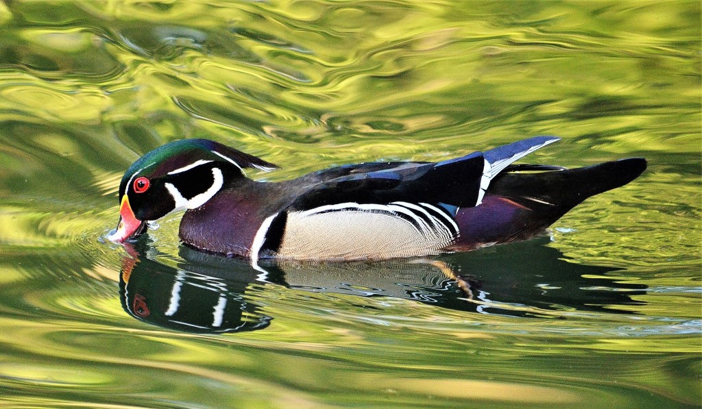 In recent years I’ve had trouble photographing wood ducks. In brief, they move out of my camera’s focus with great ease, or so it seems to me. That ended yesterday when I was finally able to get close to a wood duck at a Sacramento pond. It was my third day of visiting this spot, so maybe trust had been established between me and this one wood duck.